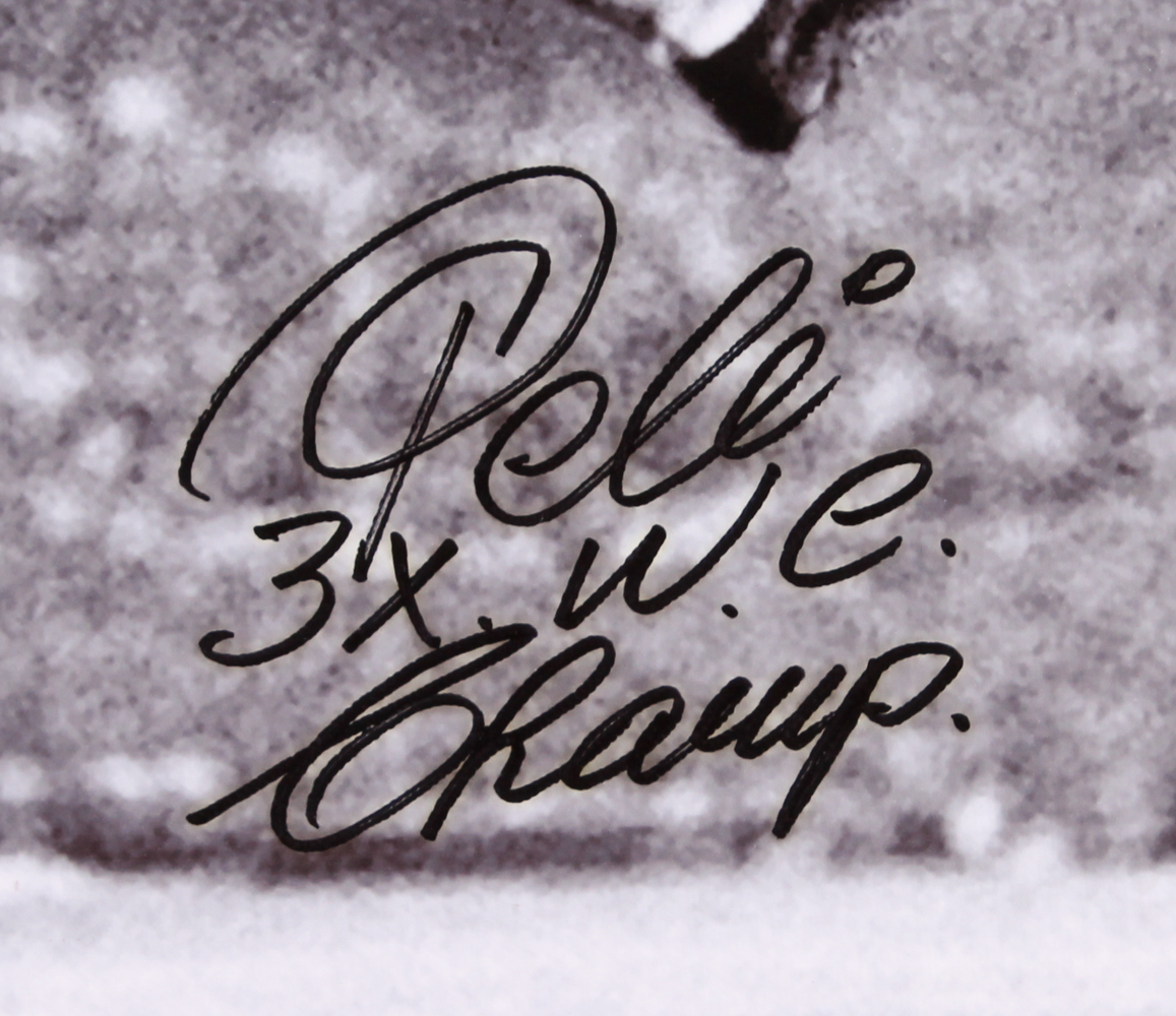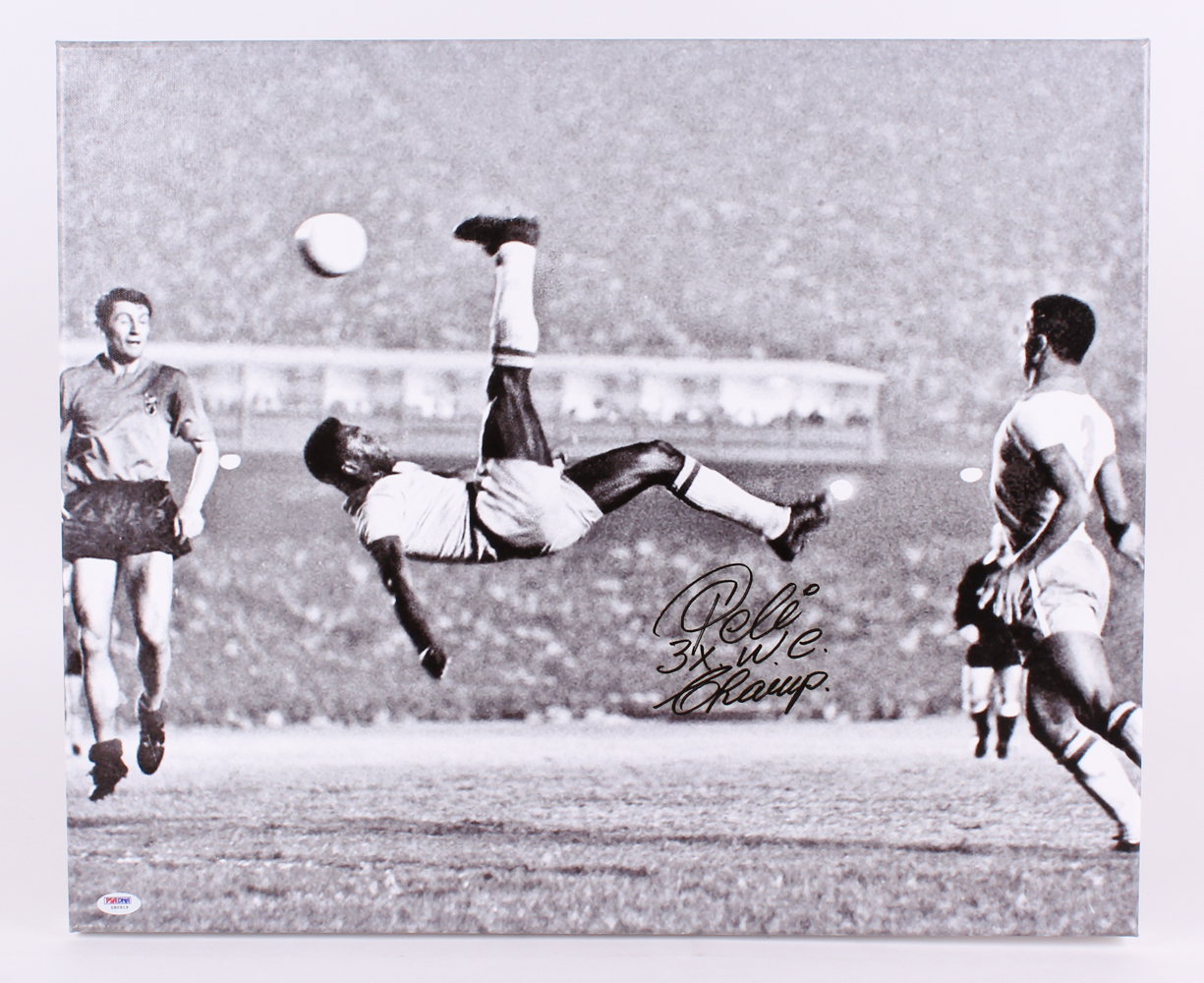 Pele Signed Brazil 25" x 20" Bicycle Kick Photo on Canvas Inscribed "3x W.C. Champ" (PSA Hologram)