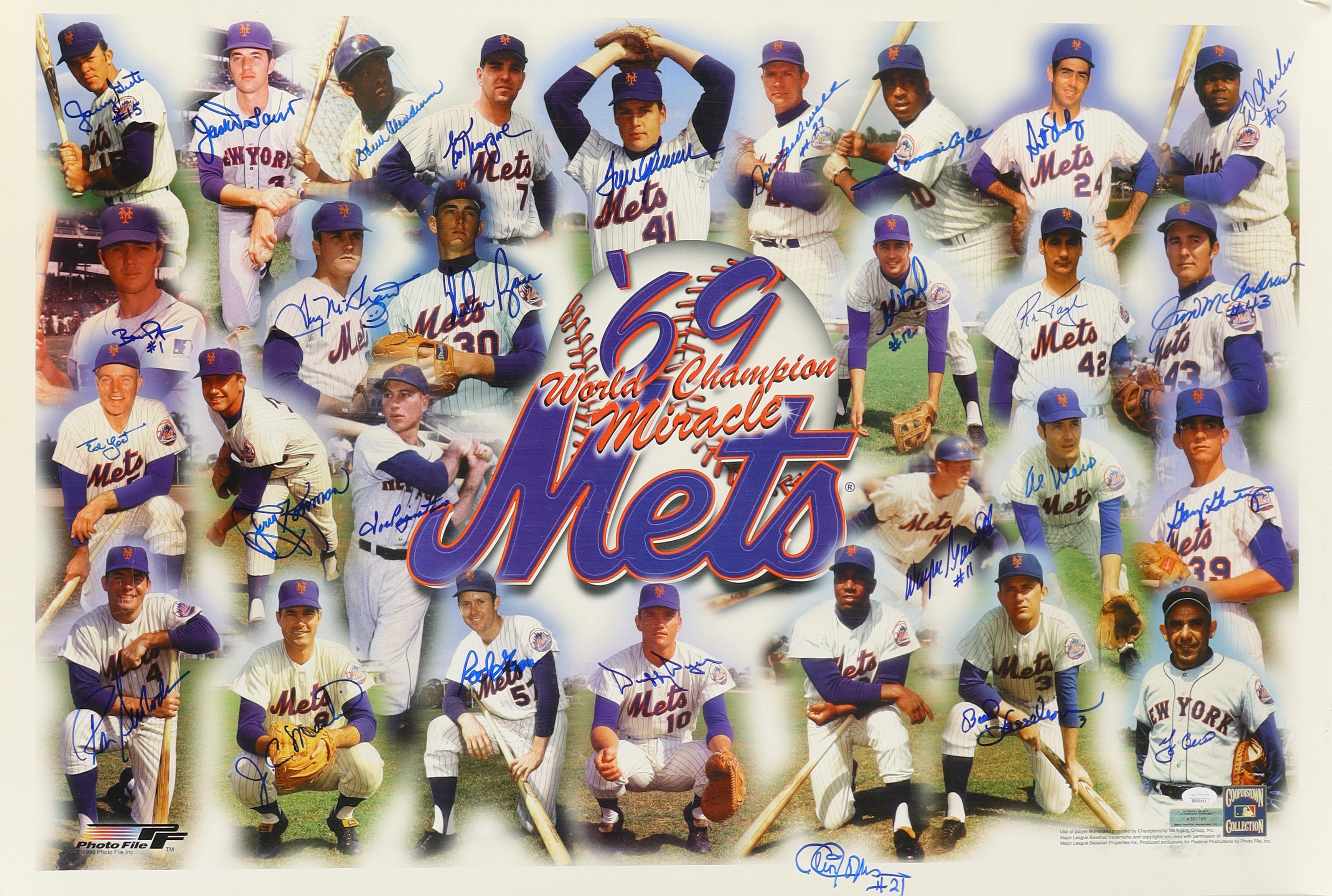 Poster measures approximately 25" x 37" and has been signed by (28) members of the 1969 World-Series winning New York Mets, including Tom Seaver, Nolan Ryan, Yogi Berra, Ed Kranepool, Duffy Dyer, Tug McGraw, Jerry Koosman, Ron Swoboda, Jerry Grote, Cleon Jones, Bud Harrelson, Al Weis, Tommie Agee, Donn Clendenon, Ed Yost, Joe Pignatano, Don Cardwell, Ed Charles, Gary Gentry, Wayne Garrett, Rod Gaspar, Jim McAndrew and (6) unknown others. See images for more details.