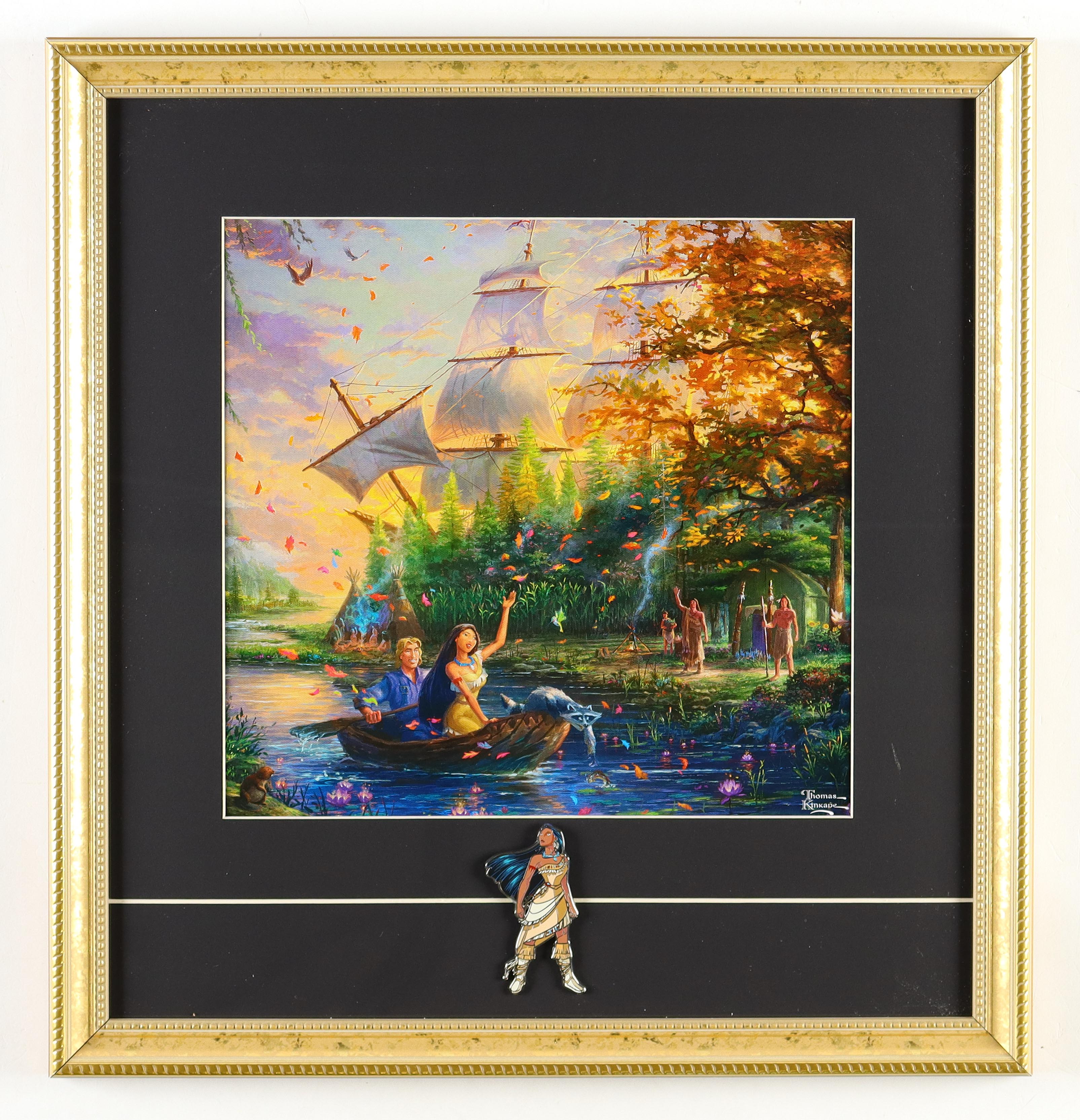 Custom frame measures approximately 18" x 19" in size. Features a Thomas Kinkade "Pocahontas" print. The display also includes a Pocahontas Disney movie character pin. Please note, the item is unsigned.
