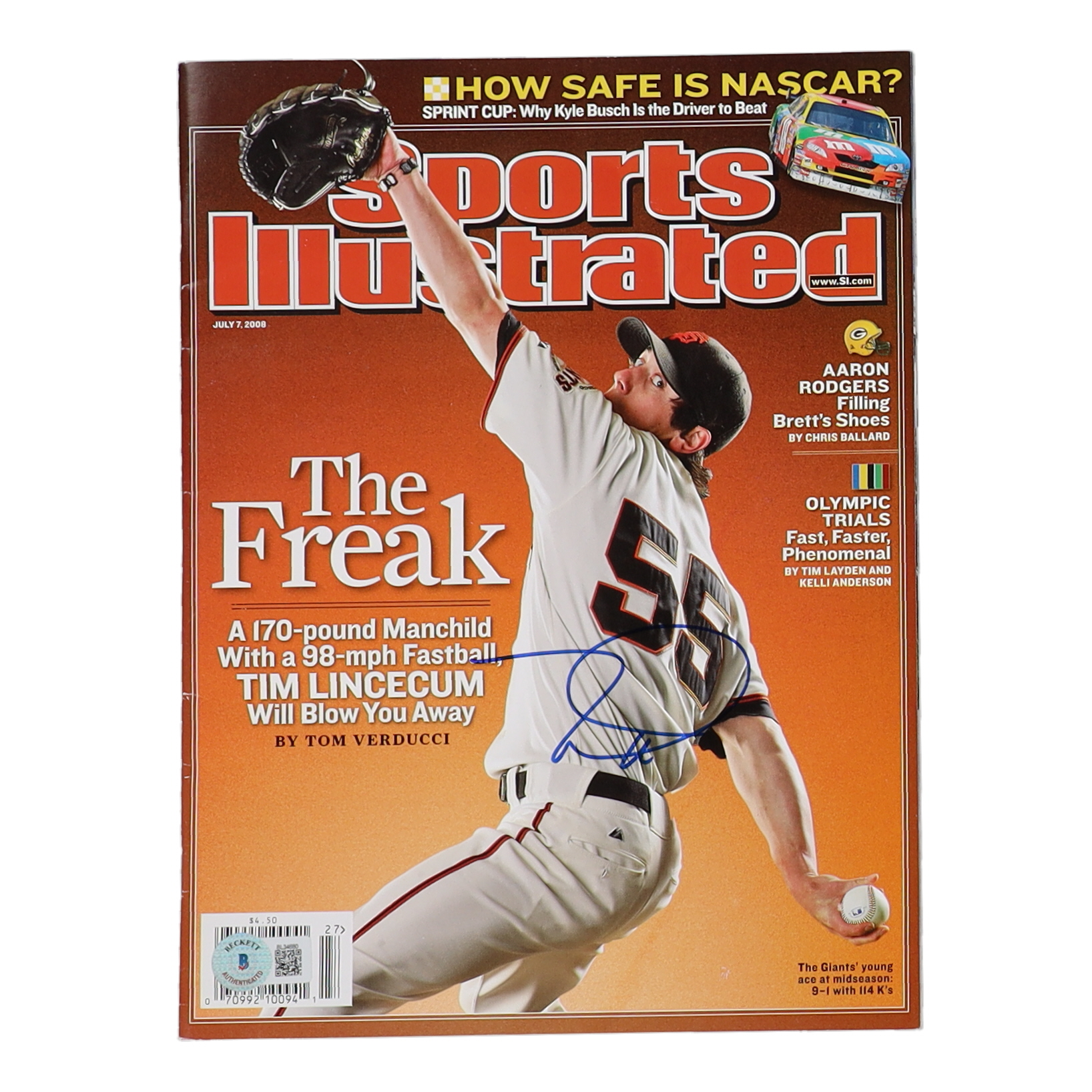 Magazine dated July 7, 2008 has been hand-signed by Tim Lincecum (San Francisco Giants).