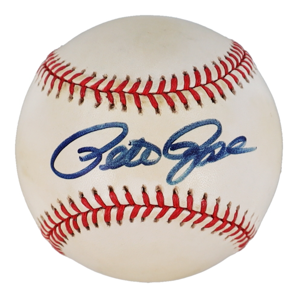 Rawlings Official American League baseball. Hand-signed by Pete Rose (Cincinnati Reds). Please note, the ball is naturally toned.