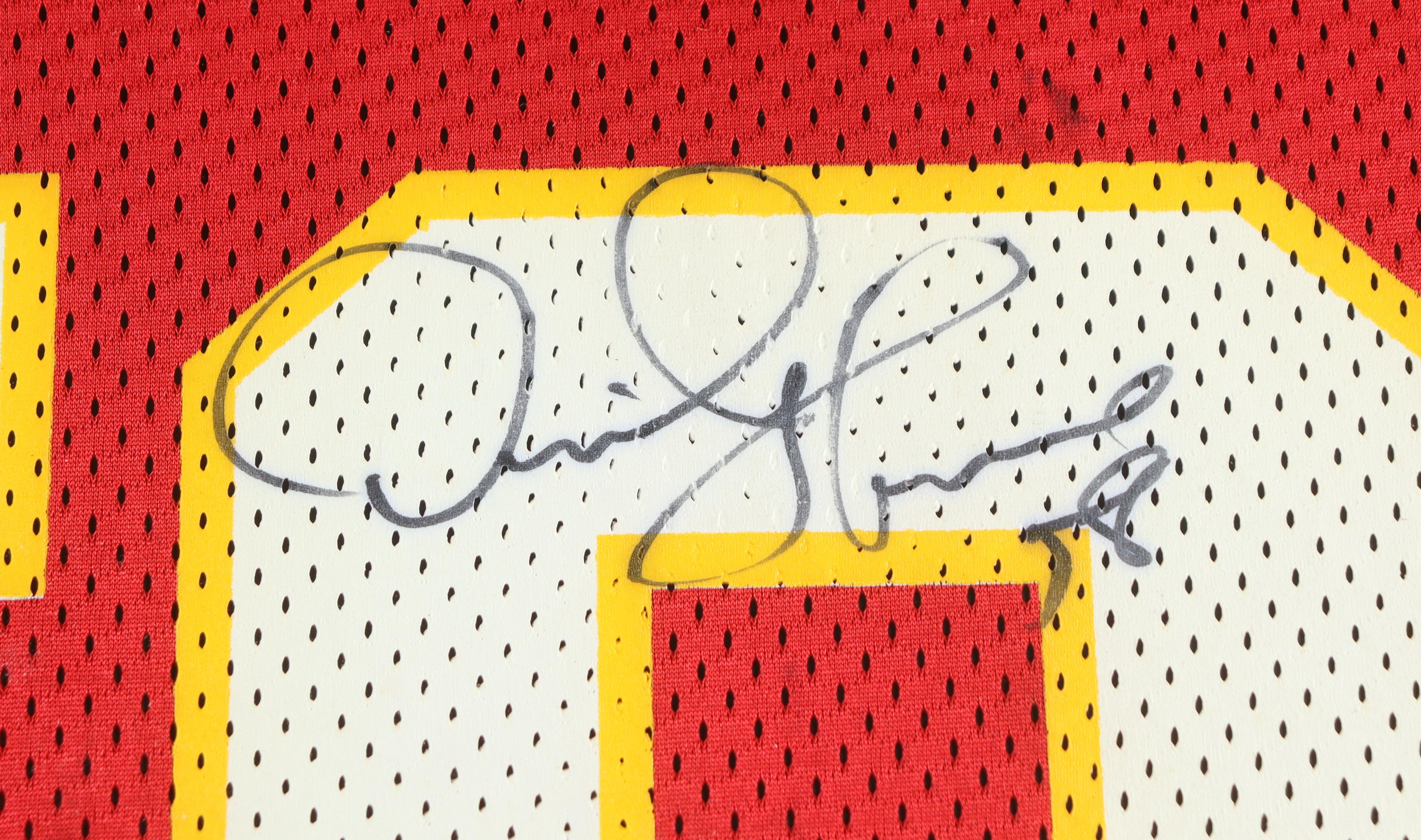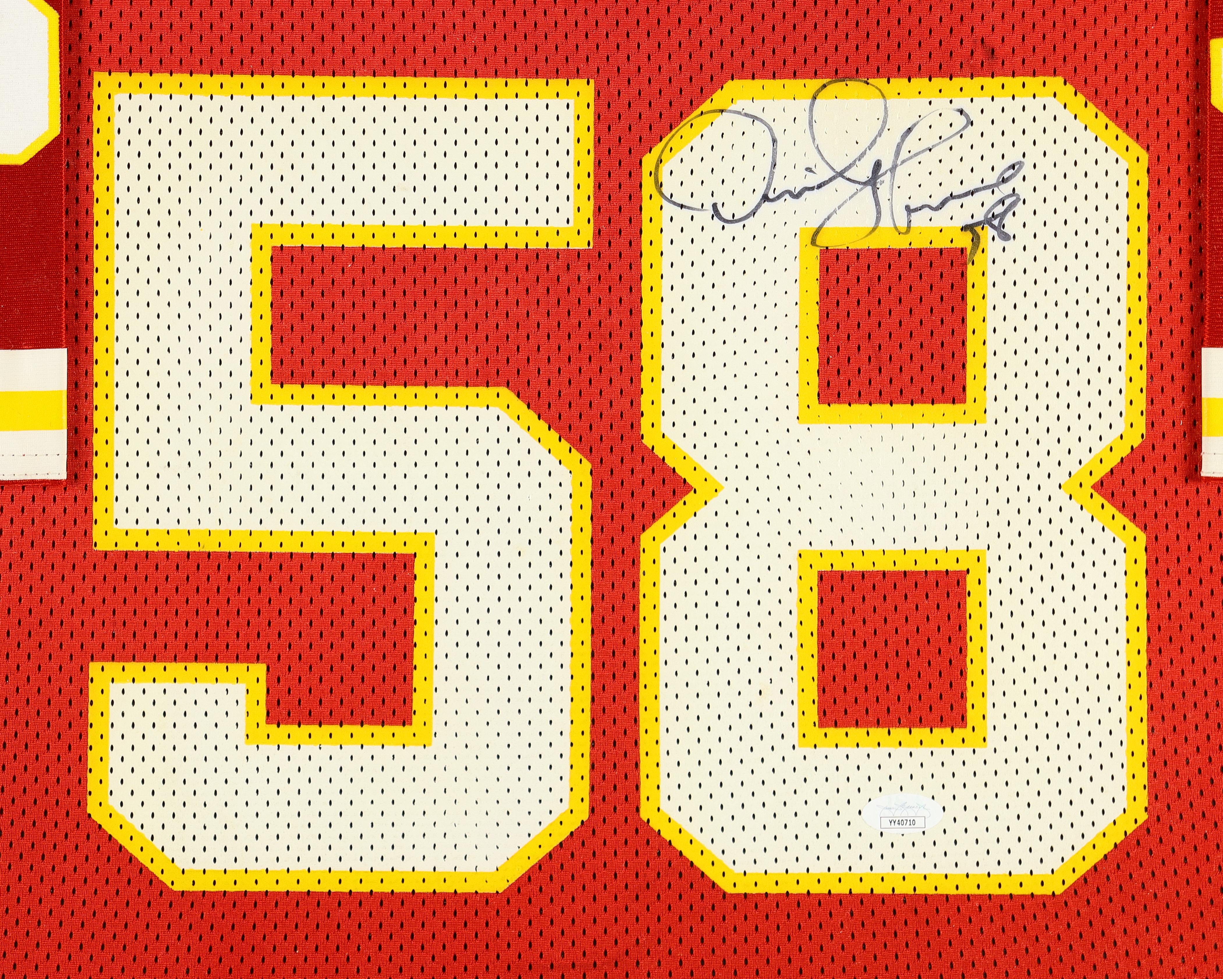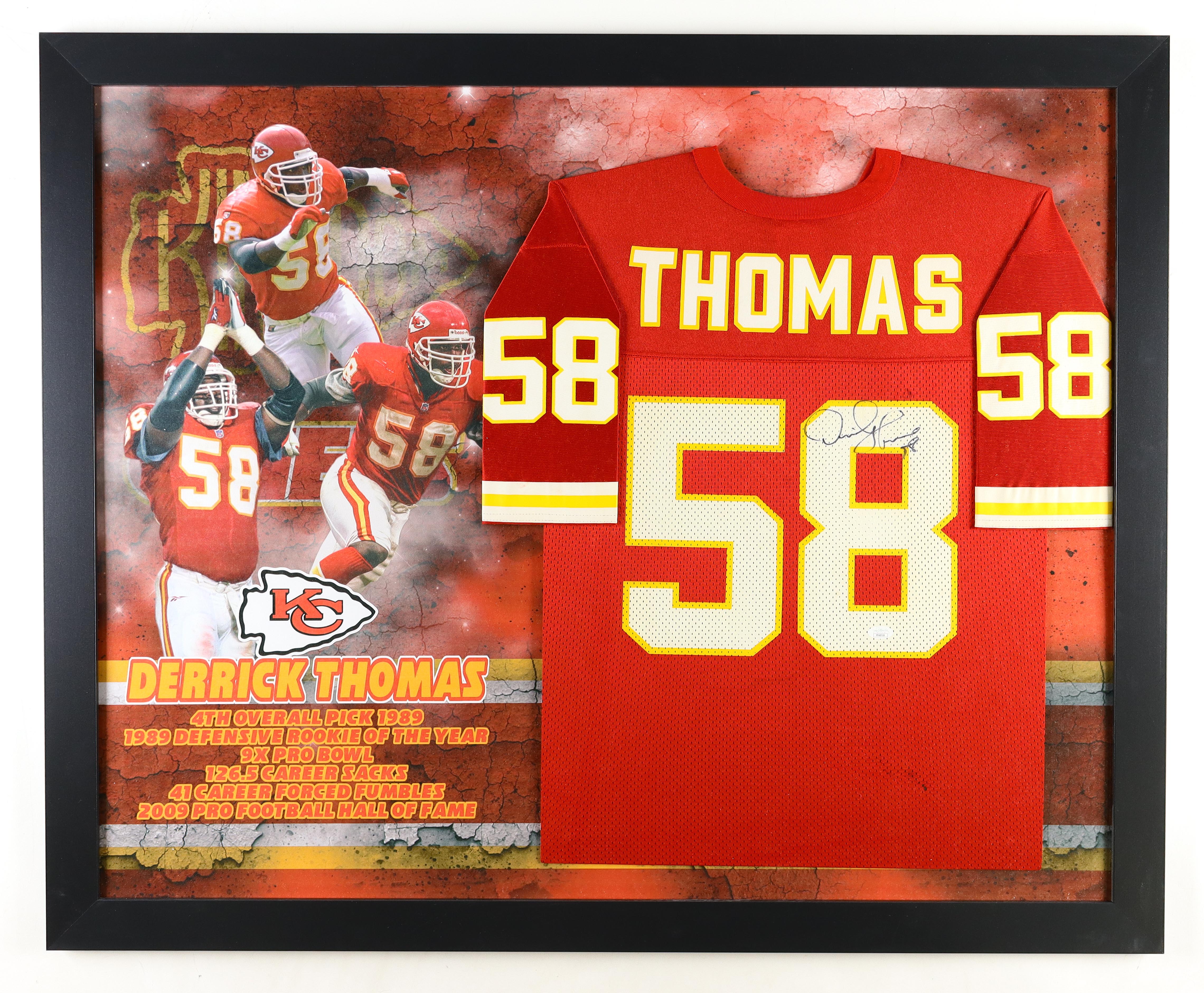 Custom frame measures 35.5" x 43.5" in size and features a jersey that has been hand-signed by Chiefs legend, Derrick Thomas!