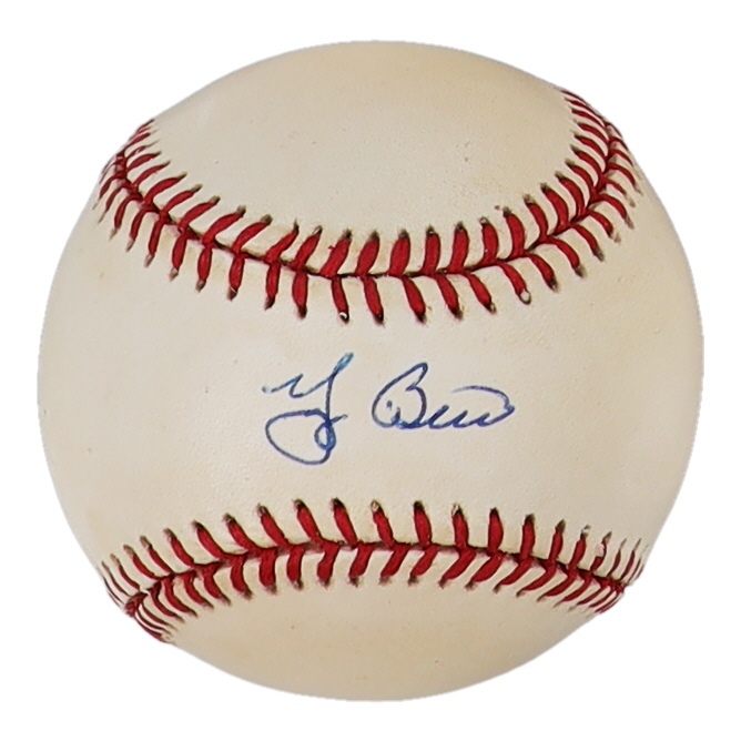 Rawlings Official American League baseball has been hand-signed by Yogi Berra (D. 2015, New York Yankees, HOF). Please note, the baseball is naturally toned.