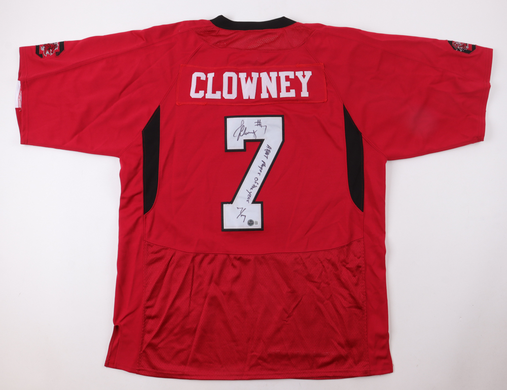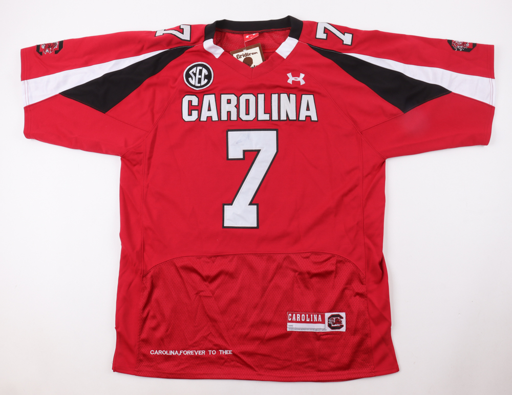 Custom football jersey. Everything sewn on, size XL. Hand-signed and inscribed by Jadeveon Clowney. The jersey is limited edition and hand-numbered #7/7.