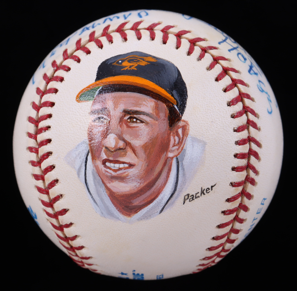 Rawlings Official National League custom painted Baseball. Hand-signed and inscribed by Brooks Robinson (D. 2023, Brooklyn Dodgers, HOF). The display stand is included as shown. Please note, baseball shows signs of natural toning.