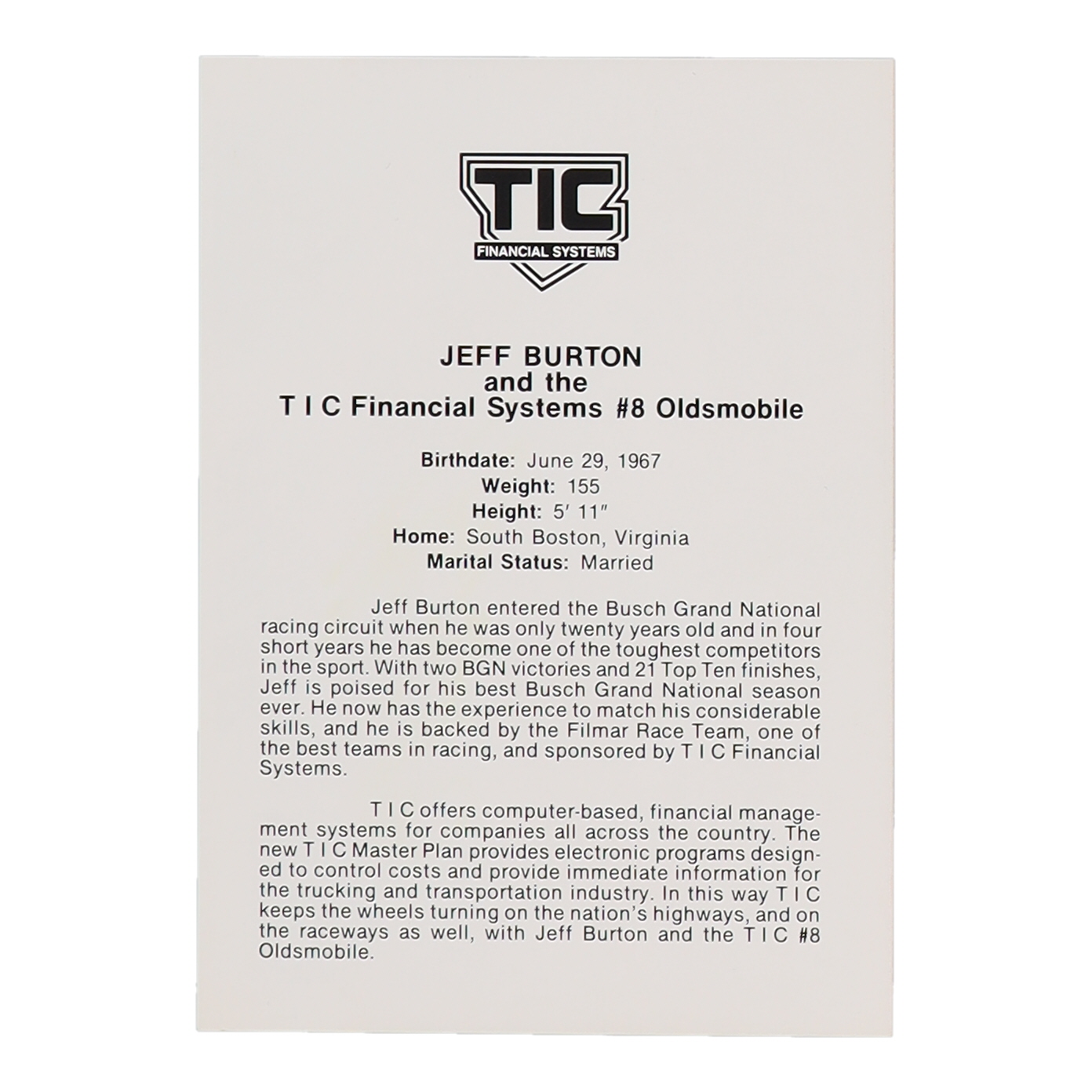 Photo measures 6" x 8" in size and has been hand-signed by Jeff Burton.