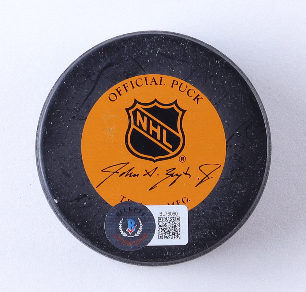 New York Islanders logo hockey puck has been hand-signed and inscribed by Denis Potvin (HOF). Please note, the signature is smudged and there is ink residue on the front of the puck.