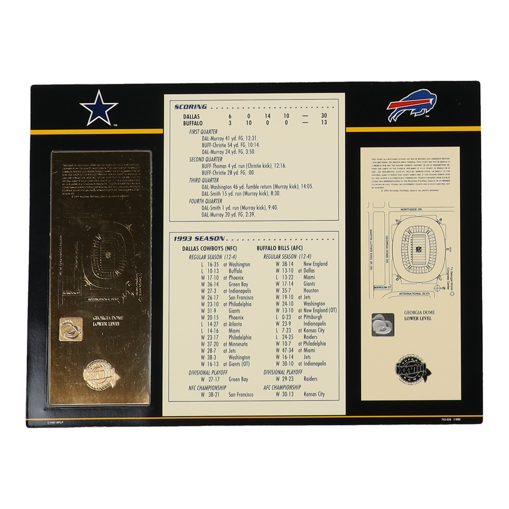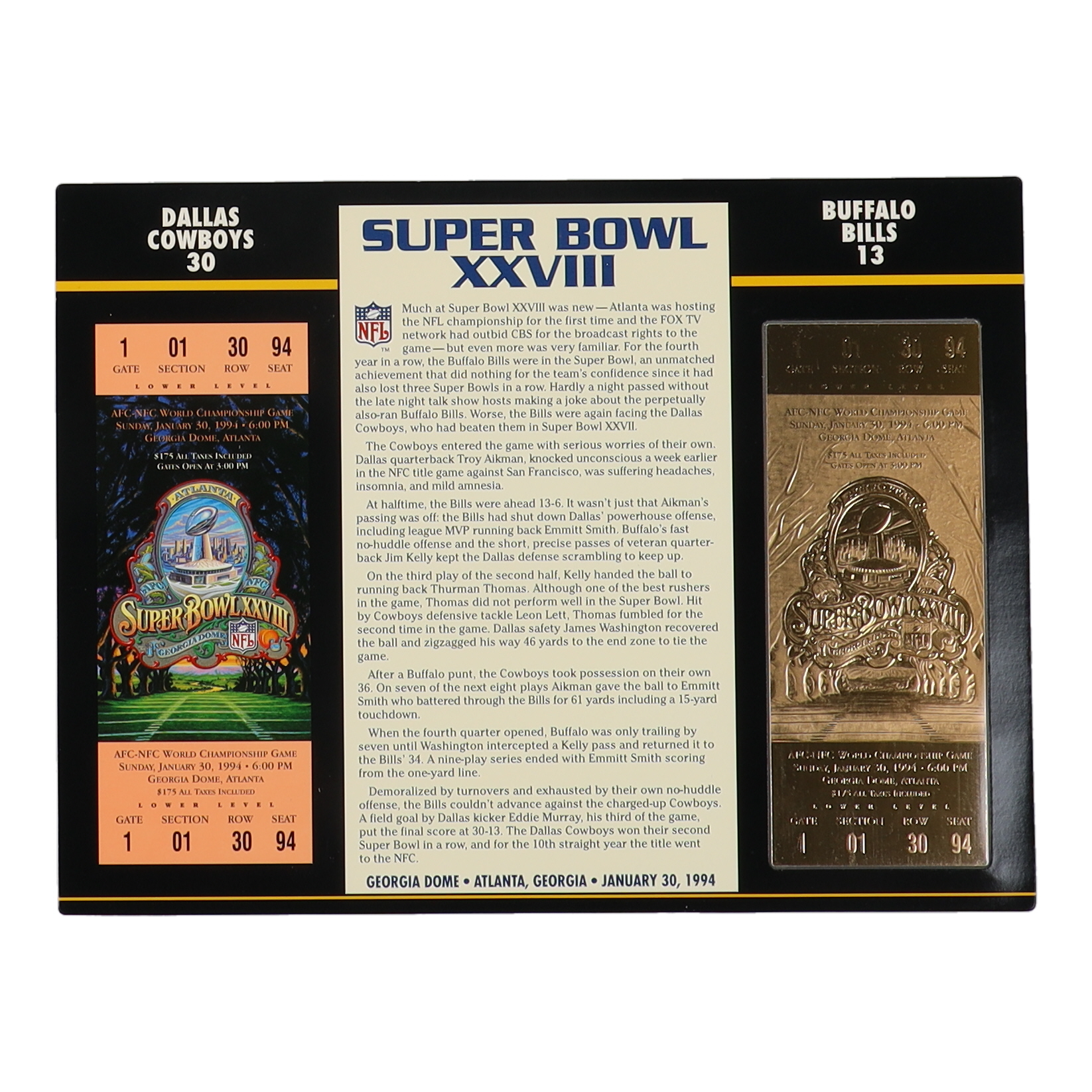 Super Bowl XXVIII Commemorative 9x12 Score Card Display with 22KT Gold Ticket