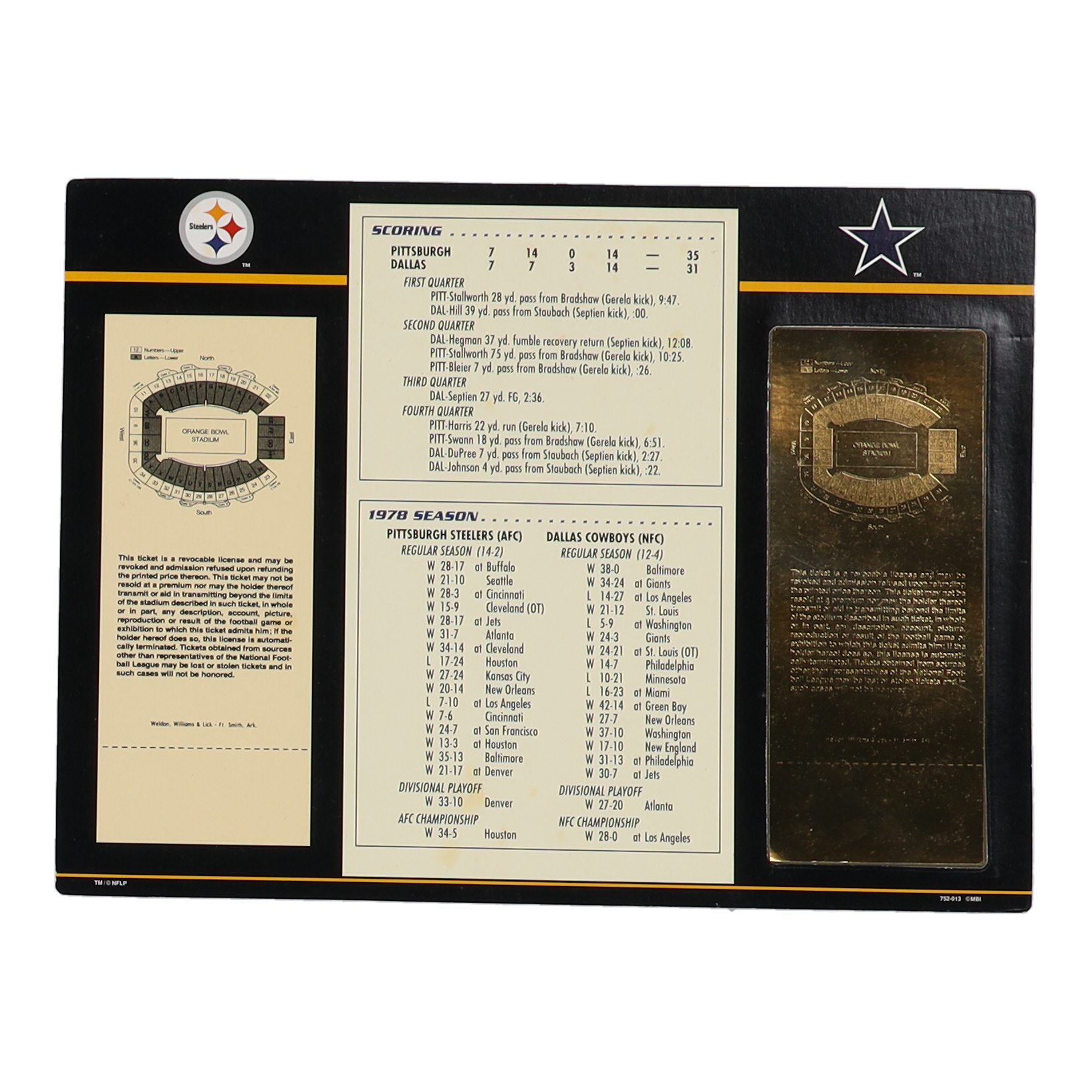 Super Bowl XIII Commemorative 9x12 Score Card Display with 22KT Gold Ticket