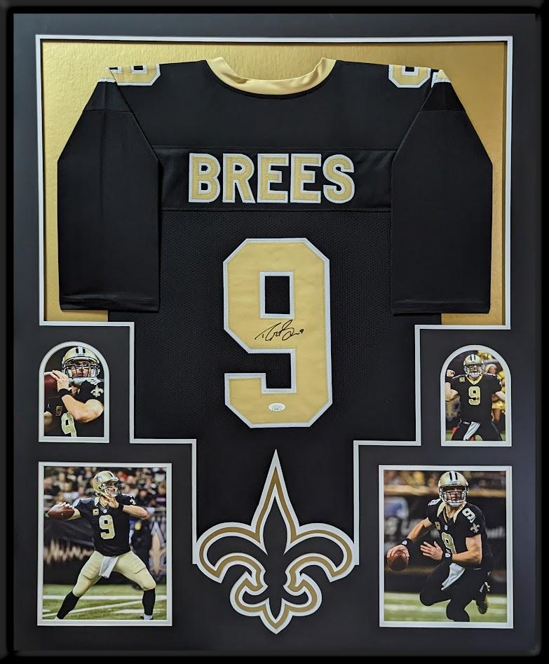 Custom frame measures 34” x 42” in size and features a jersey that has been hand-signed by Drew Brees.