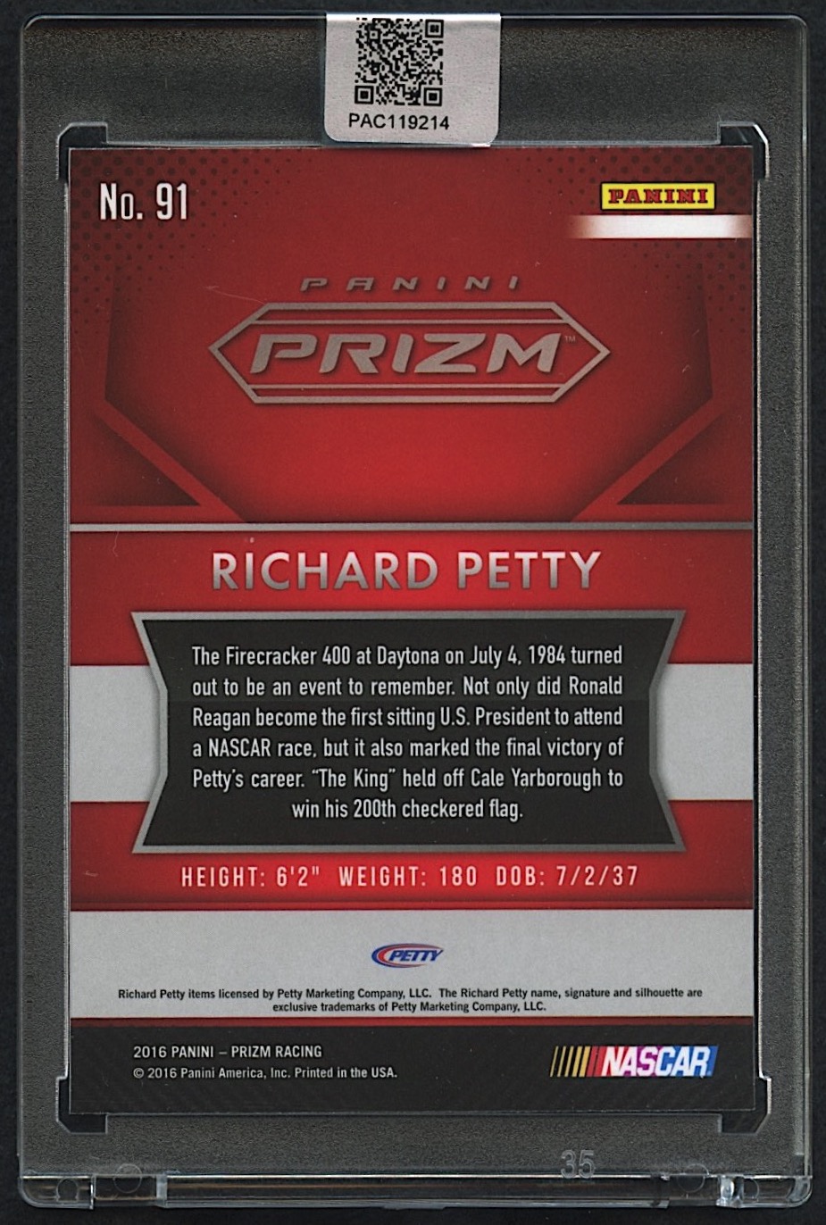 Richard Petty Signed 2016 Panini Prizm #91 (PA Encapsulated)
