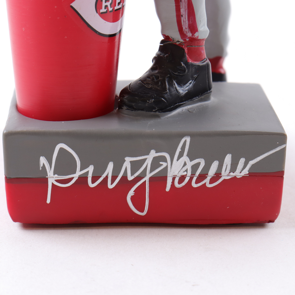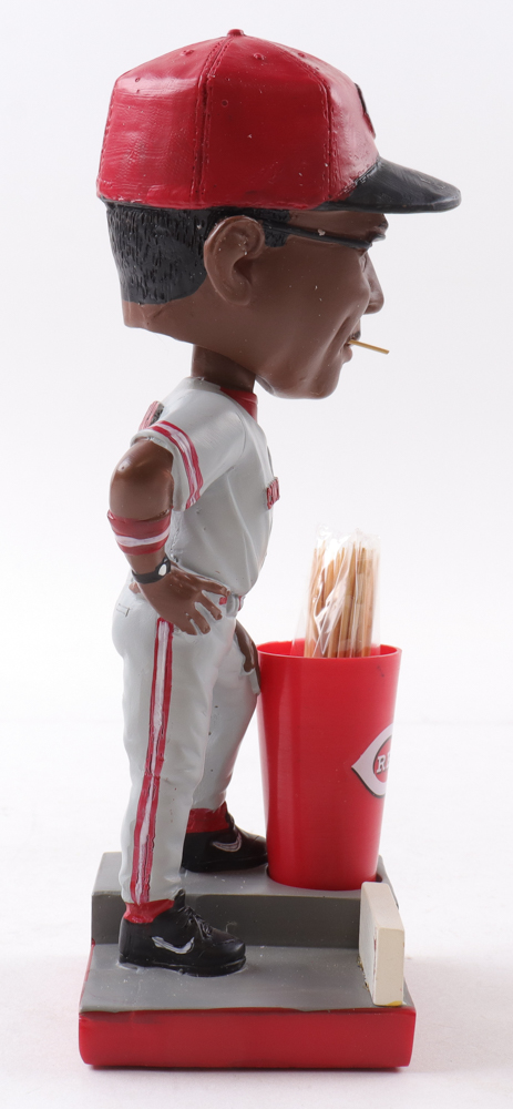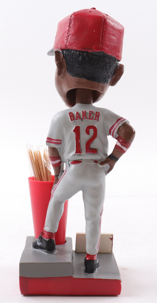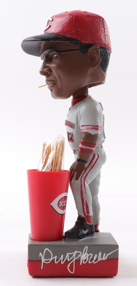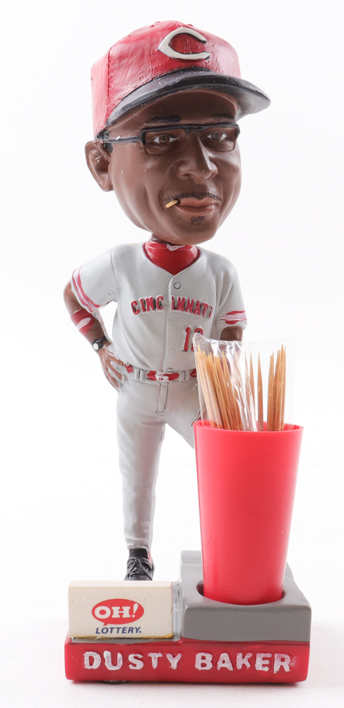 Reds.com Bobblehead measures approximately 7" in height and includes toothpicks. The base has been hand-signed by Dusty Baker (Cincinnati Reds).