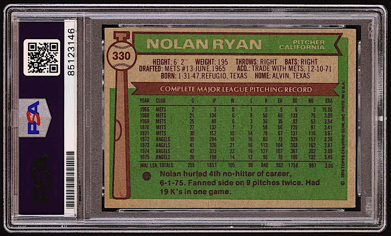 Nolan Ryan Signed 1976 Topps #330 Inscribed "108.5 M.P.H. Fastball" (PSA | Autograph Graded PSA 10)