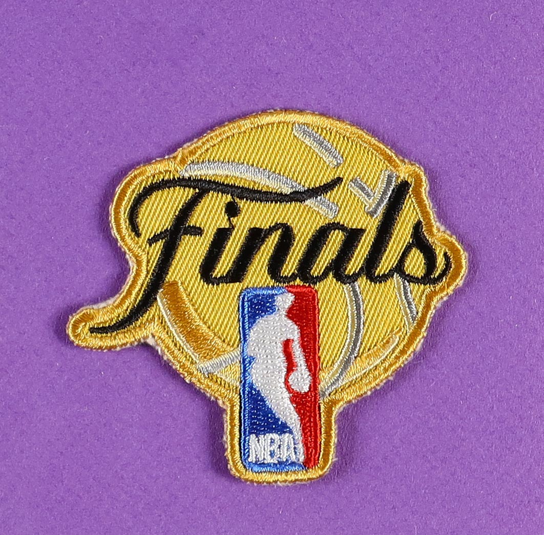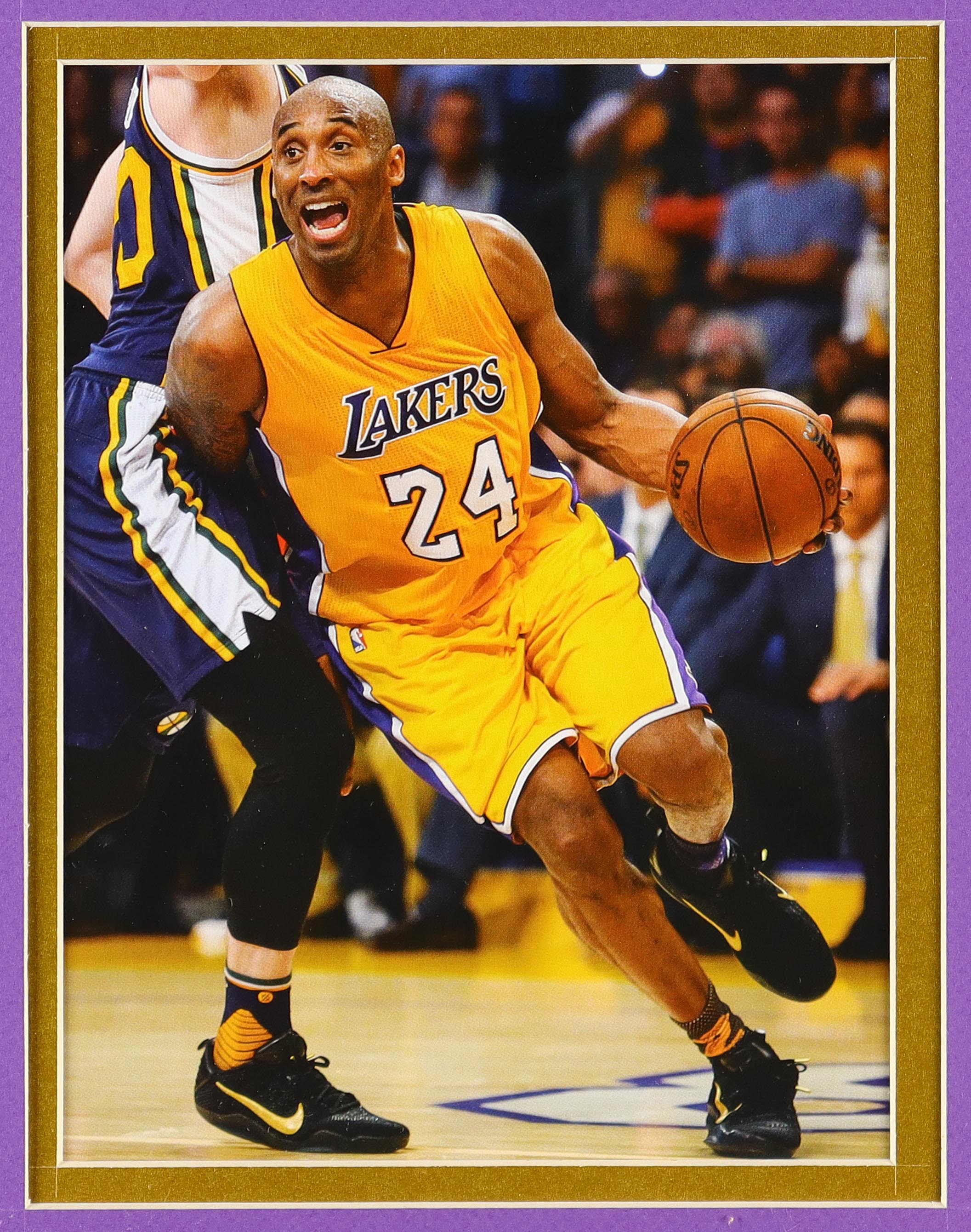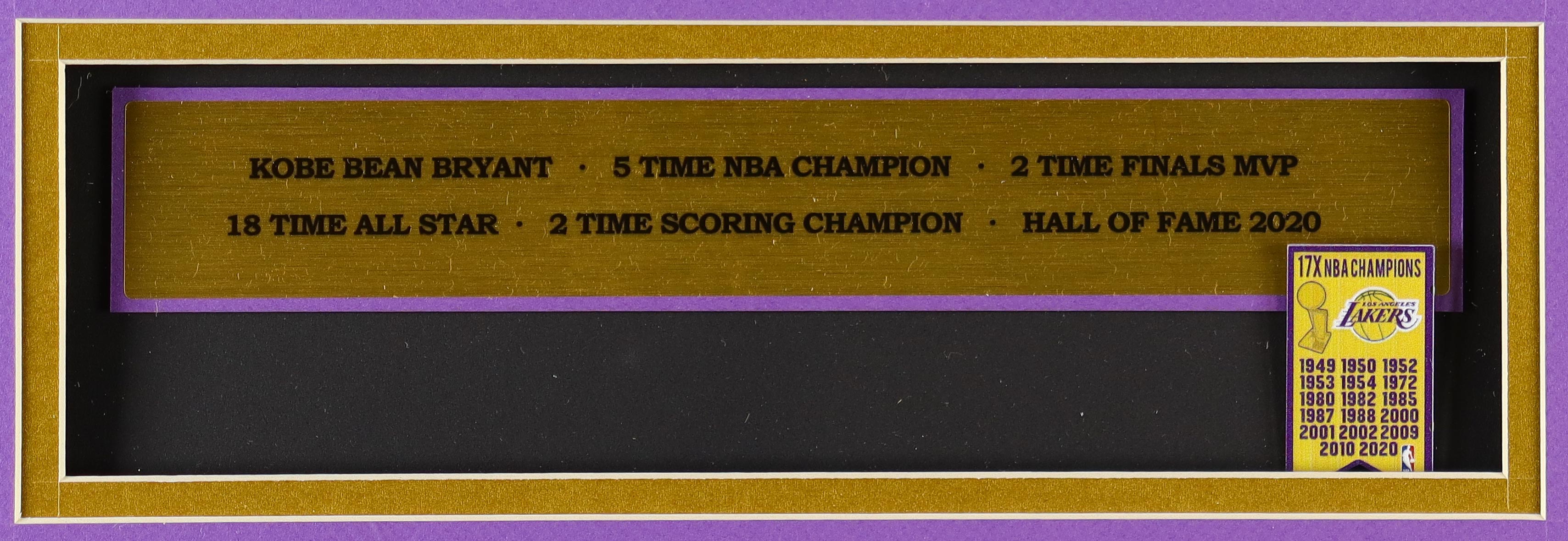 Custom frame measures approximately 32" x 36" in size and features an unsigned Kobe Bryant jersey (Los Angeles Lakers) as well as a mini metal championship banner pin and (2) cloth NBA Finals Logo patches. Please note, there is scuffing on the frame.