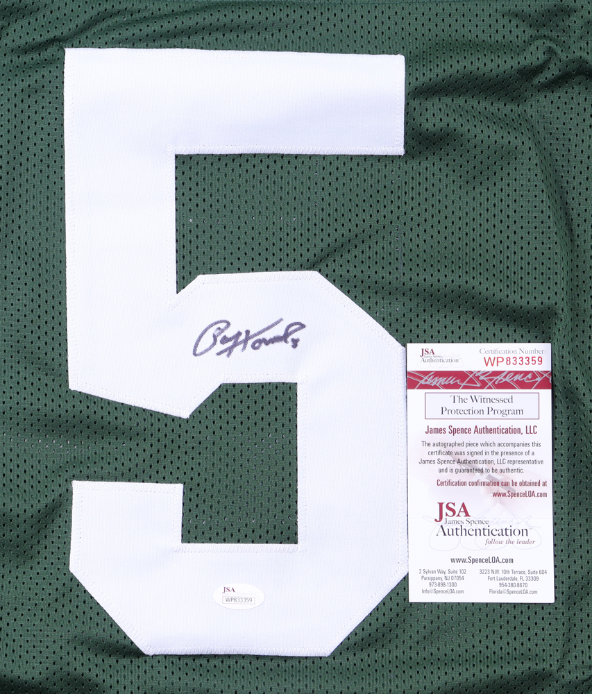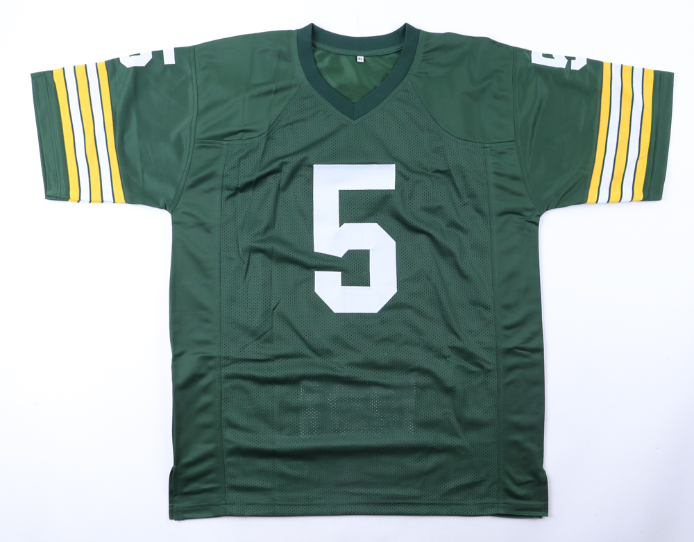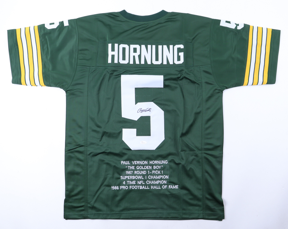 Custom jersey. Everything is sewn on, size XL. Hand-signed by Paul Hornung (D. 2020, HOF). Hornung's career highlights have been custom stitched onto the back of the jersey below the reverse numbers.