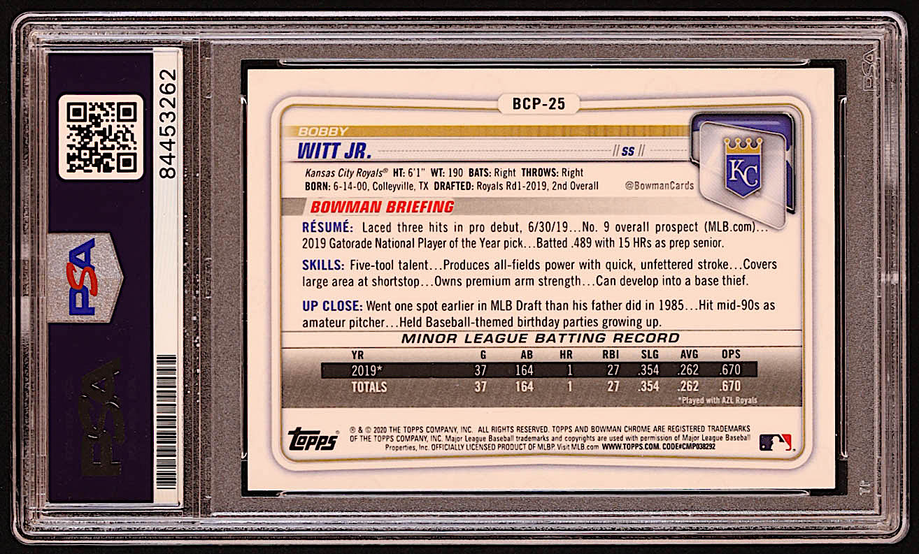 Bobby Witt Jr. Signed 2020 Bowman Chrome Prospects #BCP25 RC (PSA)