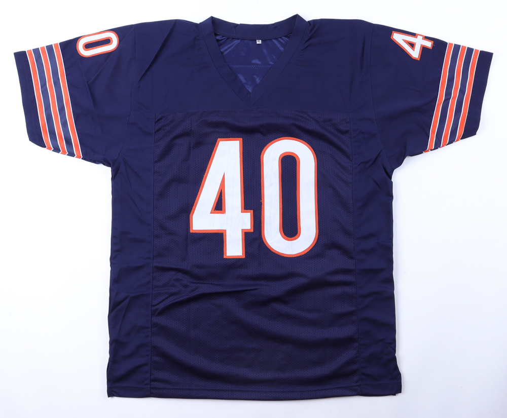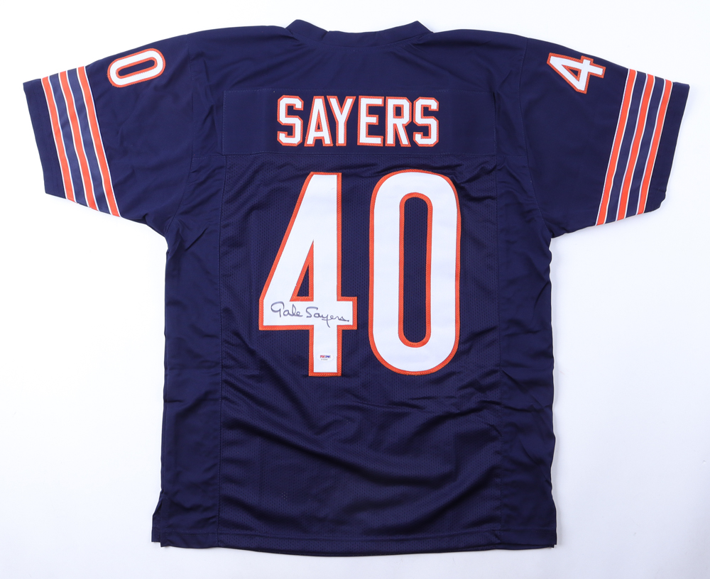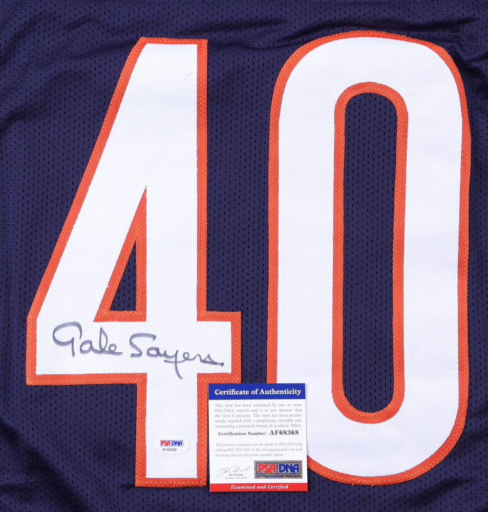Custom jersey. Everything is sewn on, size XL. Hand-signed by Gale Sayers (D. 2020, HOF). Please. note, glue is visible on the front number.