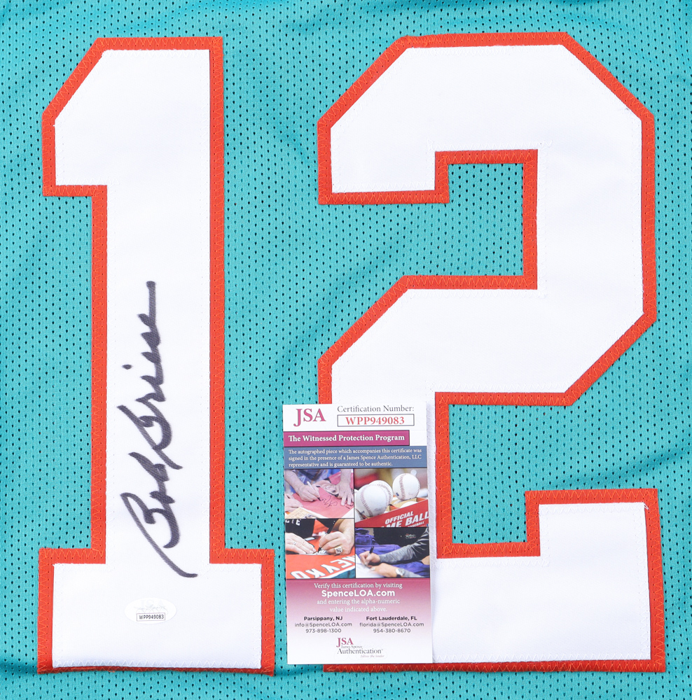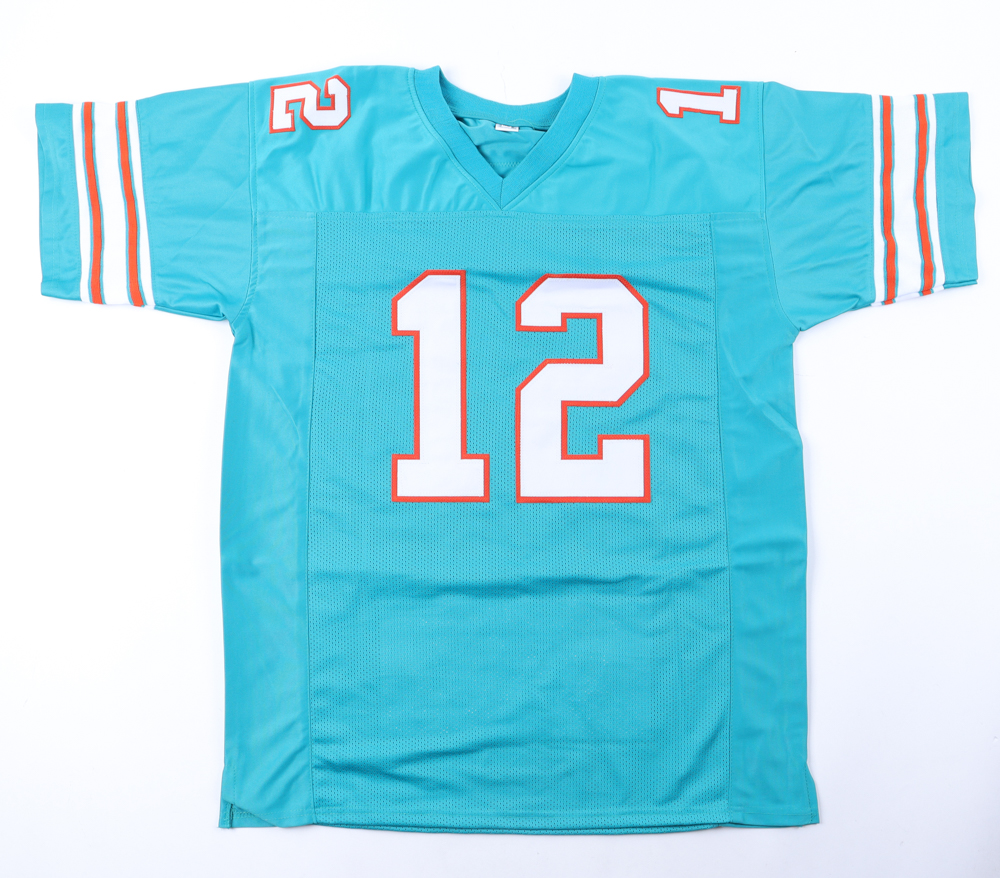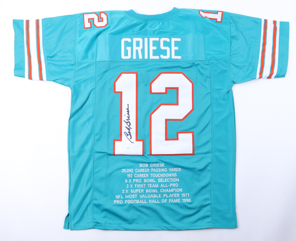 Custom jersey. Everything is sewn on, size XL. Hand-signed by Bob Griese (HOF). Griese' career highlights have been custom stitched onto the back of the jersey below the reverse numbers.
