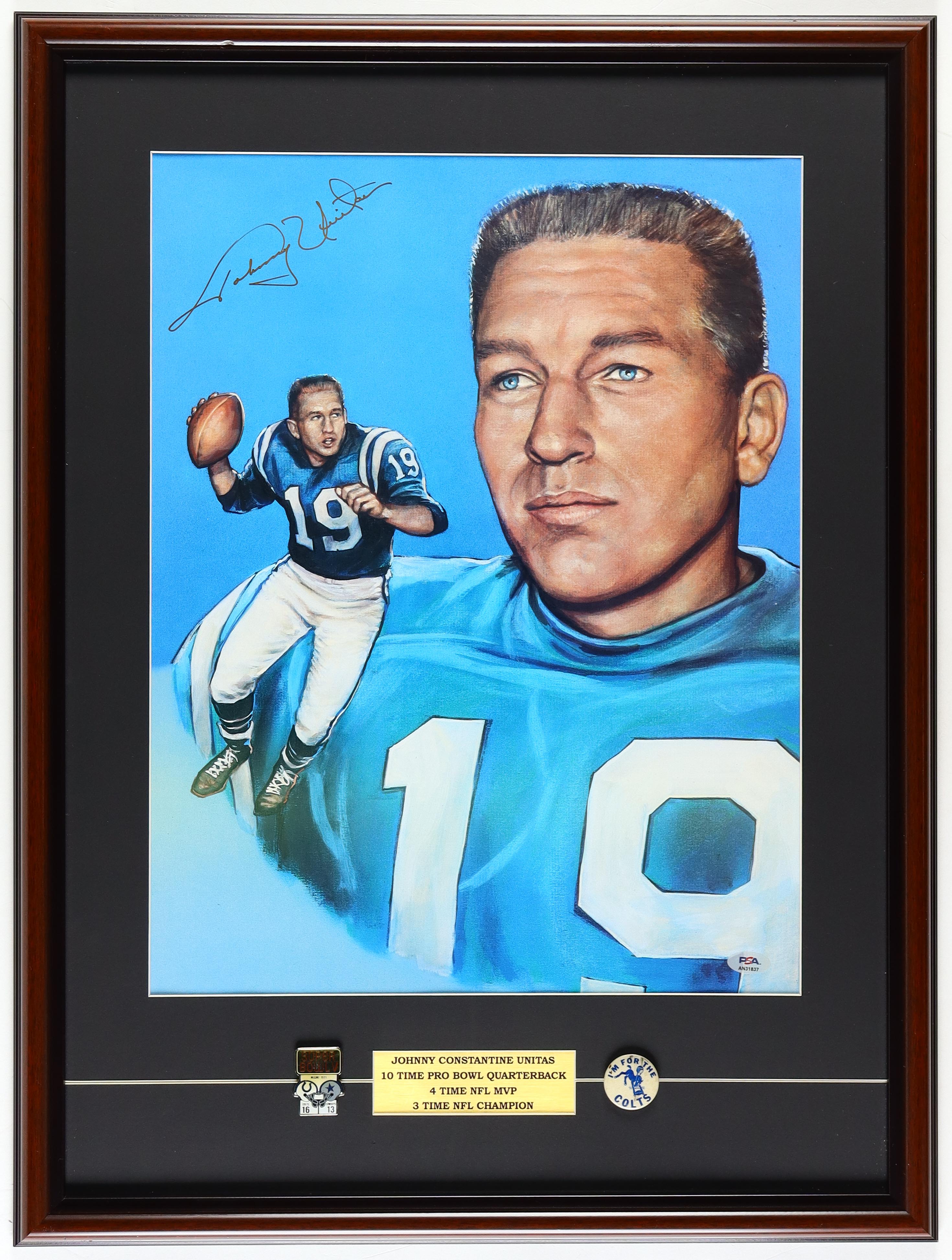 Custom frame measures approximately 21" x 28" in size and features an art print that has been hand-signed by Johnny Unitas (D. 2002, Baltimore Colts, HOF). The display also includes a Super Bowl V pin as well as a vintage Colts pin.