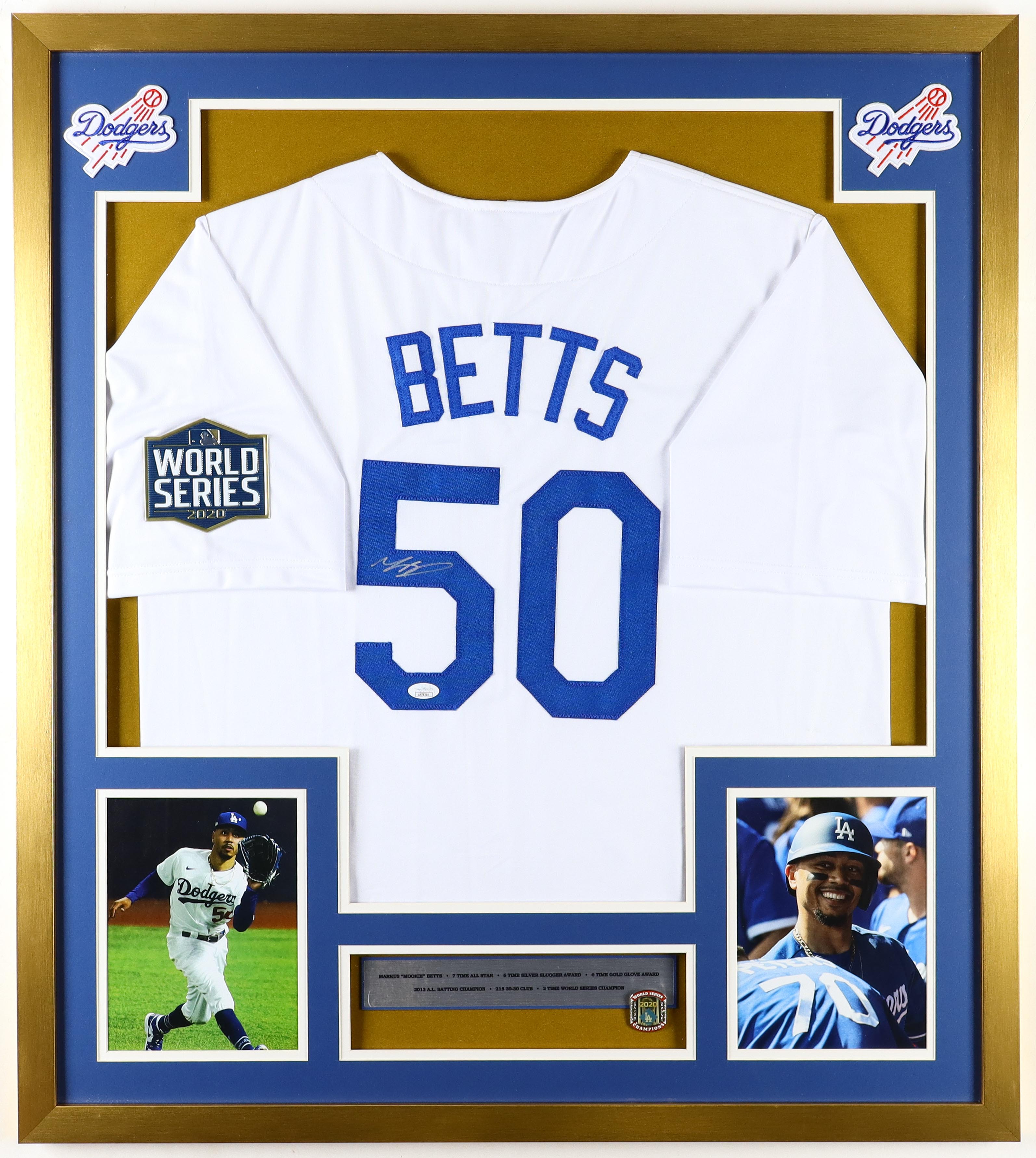 Mookie Betts Signed Custom Framed Jersey Display With 2020 Rhinestone World Series Ring Pin & (2) Cloth Logo Patches (JSA)