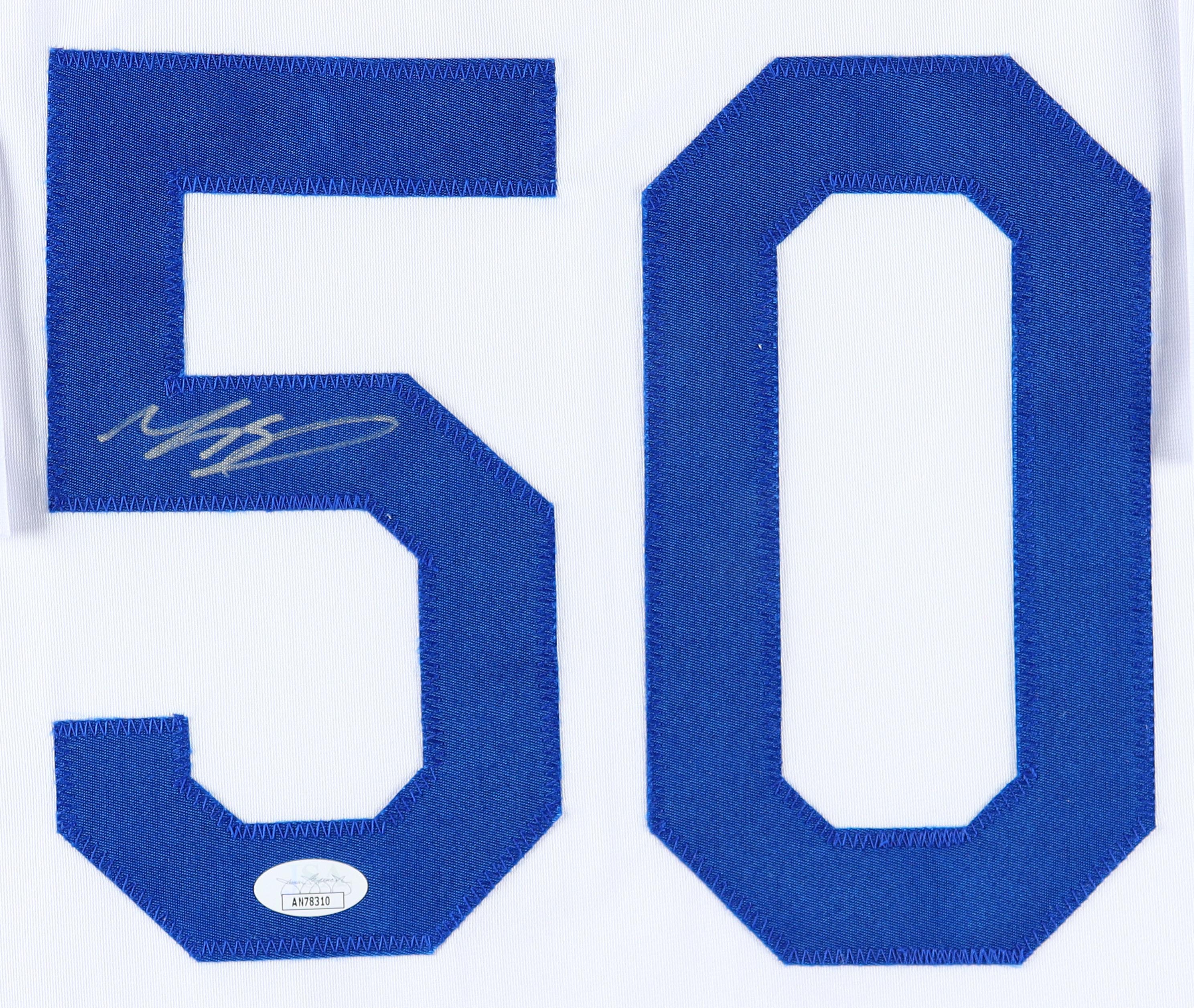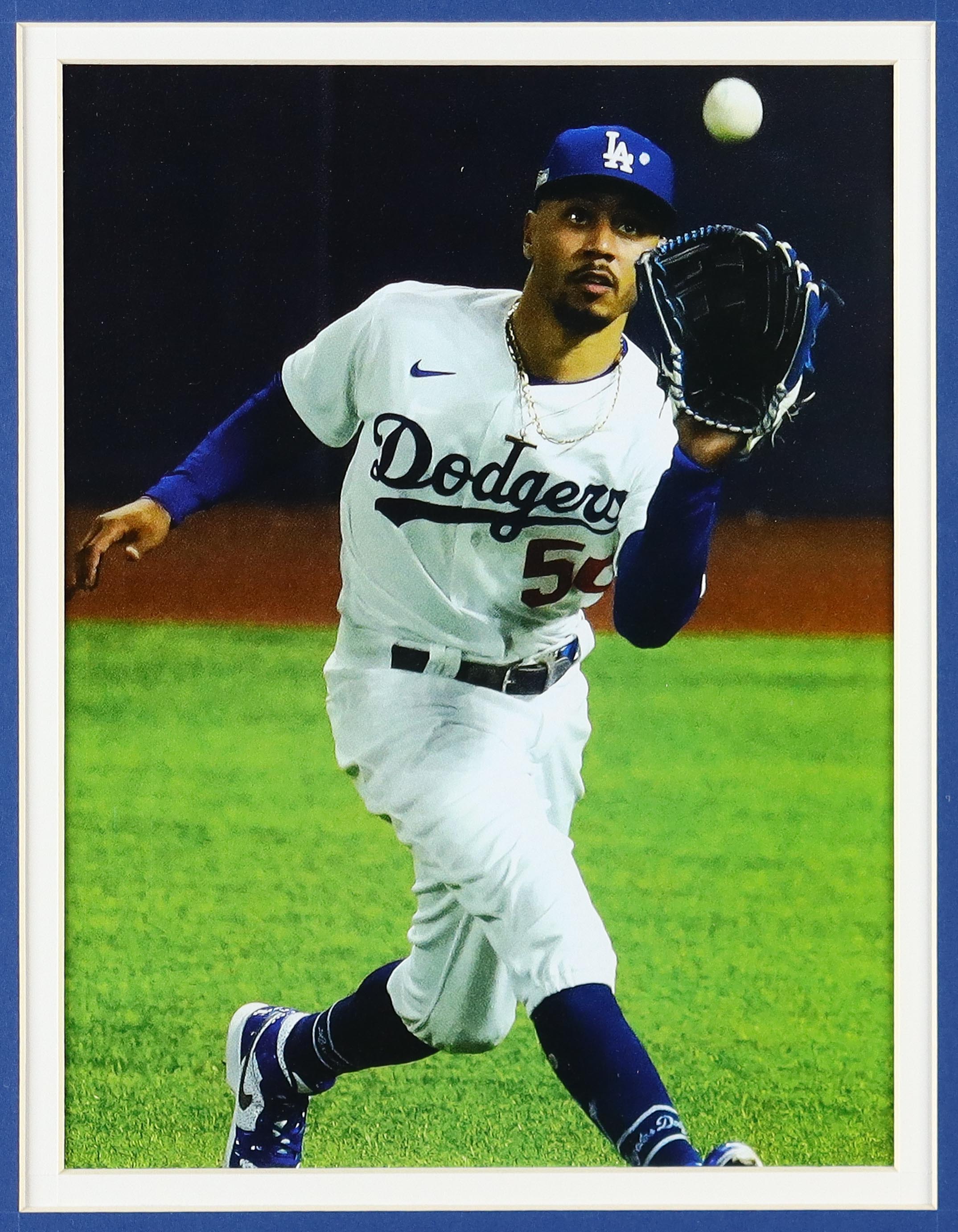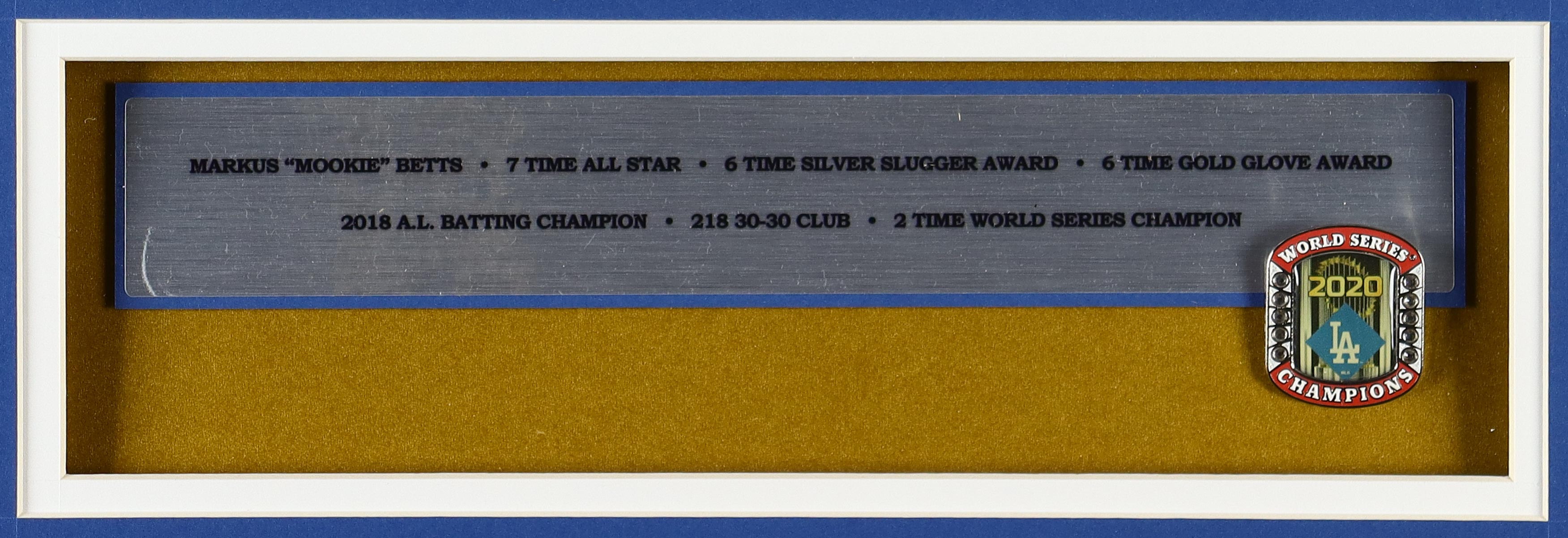 Custom frame measures approximately 32" x 36" in size and features a jersey that has been hand-signed by Mookie Betts. The display also includes a 2020 Rhinestone World Series Ring Pin as well as (2) cloth logo patches.