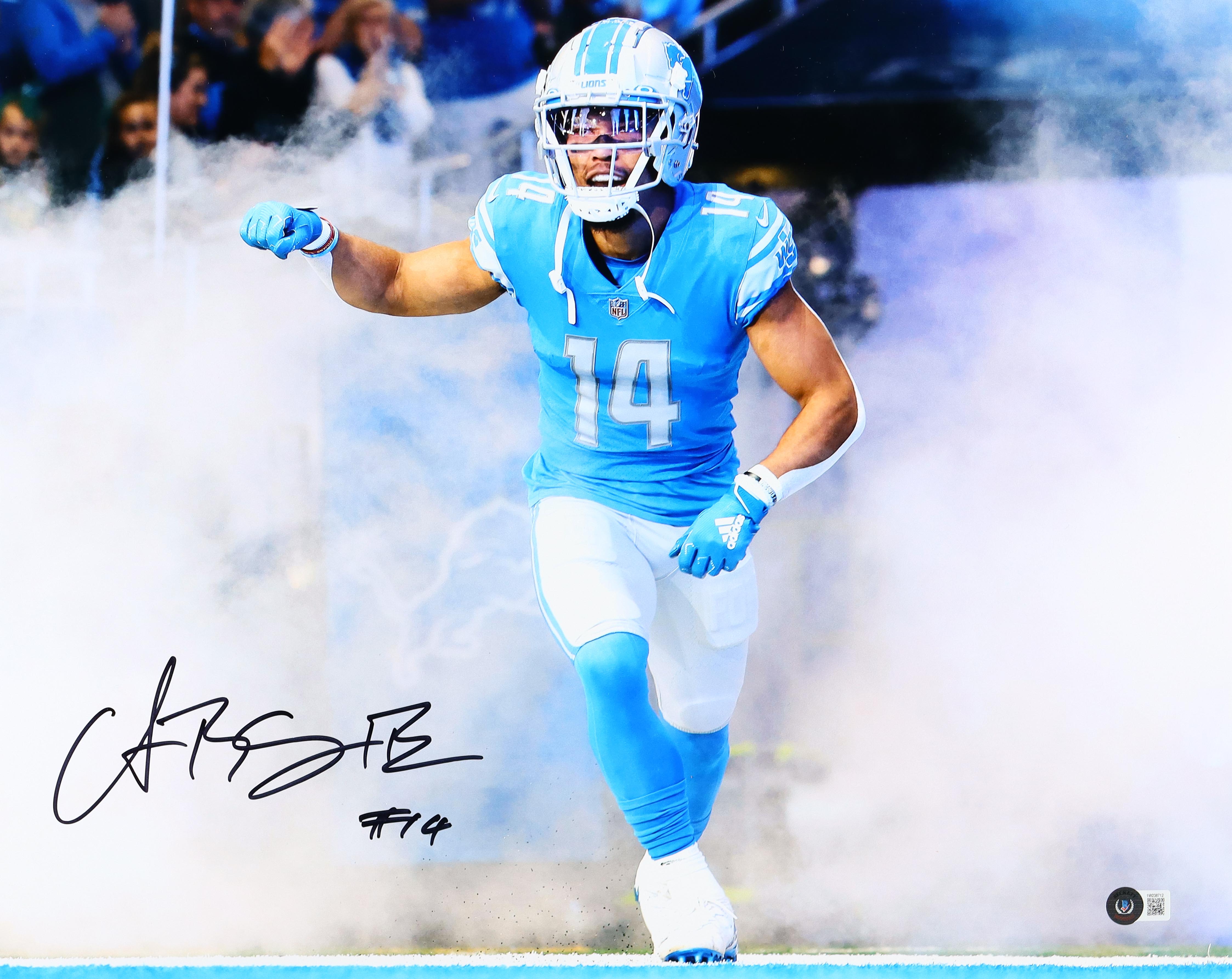 Photo measures 16" x 20" in size and has been hand-signed by Amon-Ra St. Brown (Detroit Lions).