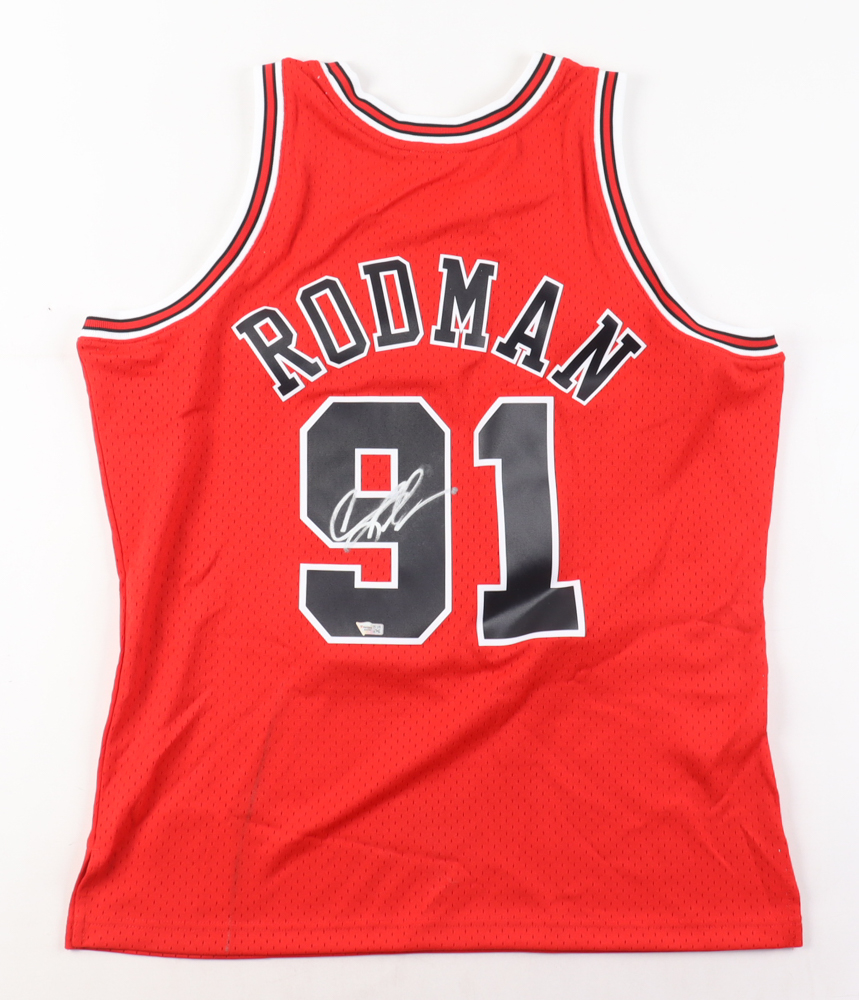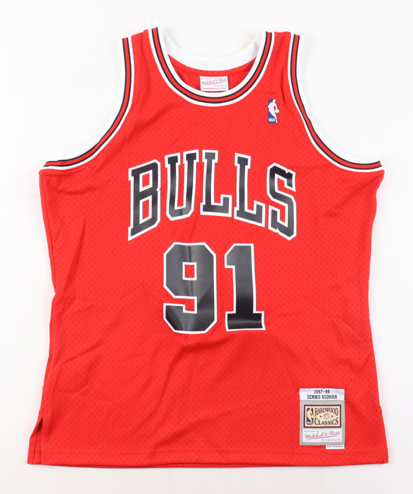 Mitchell & Ness jersey. Everything is pressed on, size L. Hand-signed by Dennis Rodman (Chicago Bulls, HOF). Please not, there is a stray ink mark at the back of the jersey.