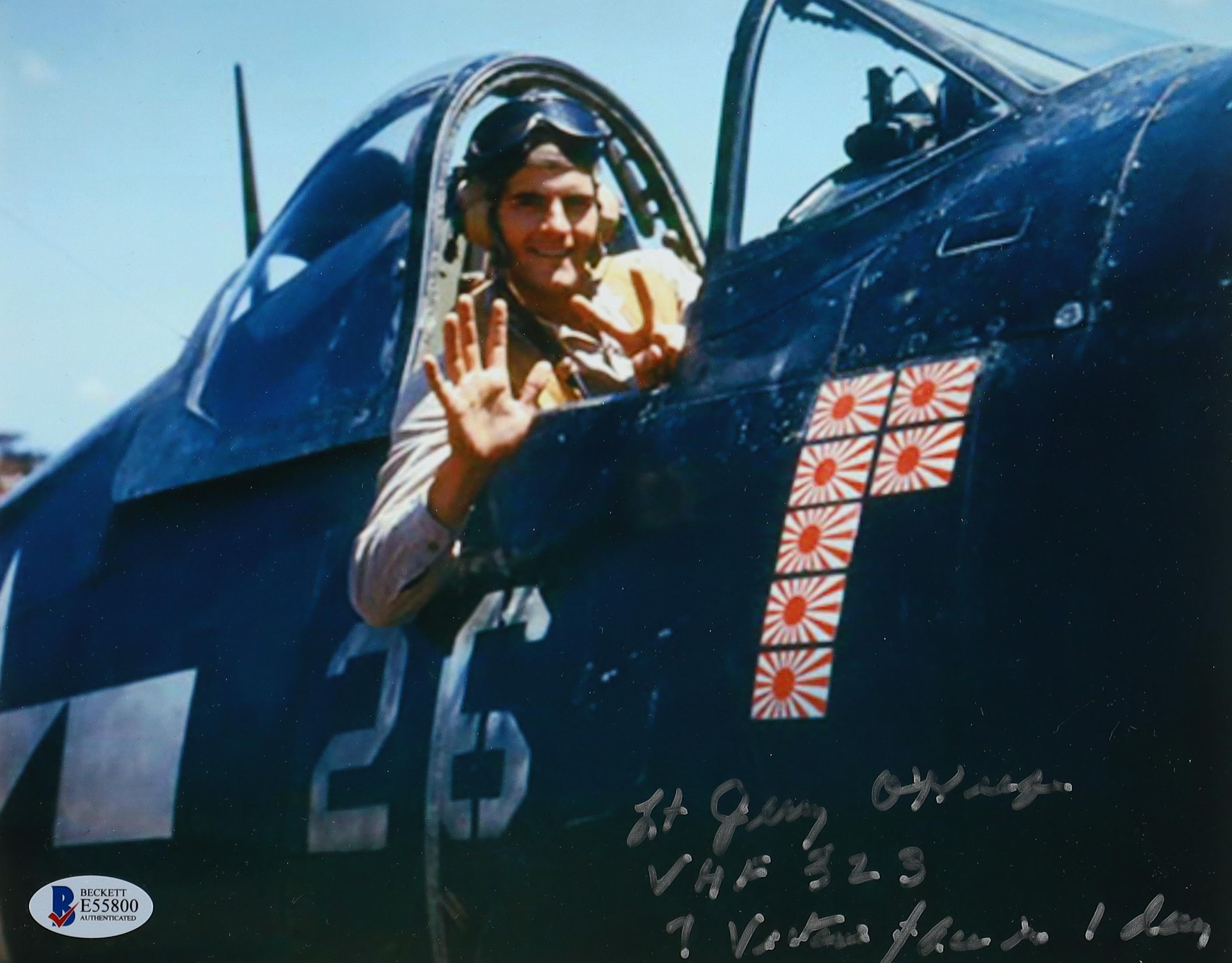 Lt. Jerry O'Keefe Signed WWII 8x10 Photo Inscribed "VMF 323" & "7 Victories All In 1 Day!" (Beckett)