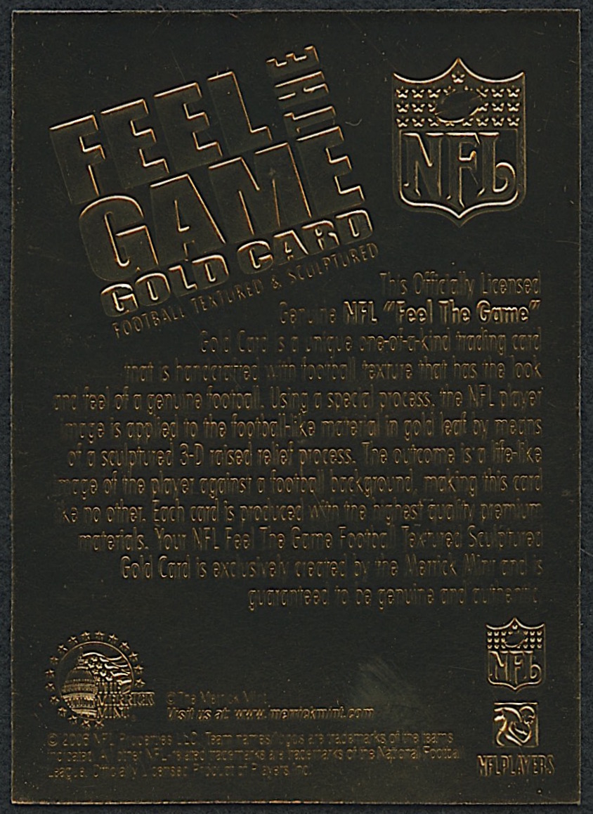 This is a one-of-a-kind officially licensed "Feel The Game" NFL Football gold card. Produced in 2006. Produced with genuine football-like material stock giving it the look and feel of a real NFL Football. The card is limited edition. The signature is a facsimile (not hand-signed).