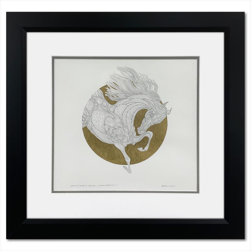 "Sketch D" is an original pen and ink drawing on paper with hand laid goldleaf by Guillaume Azoulay, hand signed by the artist. This piece comes custom framed. Includes Letter of Authenticity. Measures approx. 23.5" x 22.5" (frame), 14" x 13" (image).