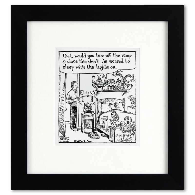 Enter a surreal and satirical world of twisted imagination and award winning creativity. "Lights On" is an original pen & ink drawing on paper by Dan Piraro, creator of the critically acclaimed and award winning comic strip, Bizarro. This piece is hand signed, comes custom framed and includes a letter of authenticity. Measures approximately 12" x 11" (frame), 7" x 6" (image).This item requires special handling and may have a longer than usual turnaround.
