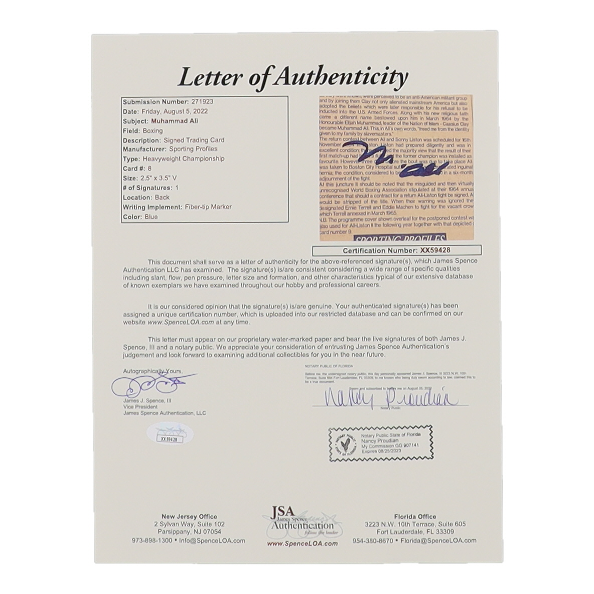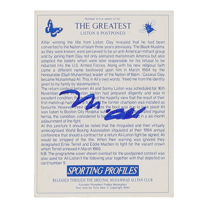 Trading card has been hand-signed by Muhammad Ali (D. 2016, HOF).