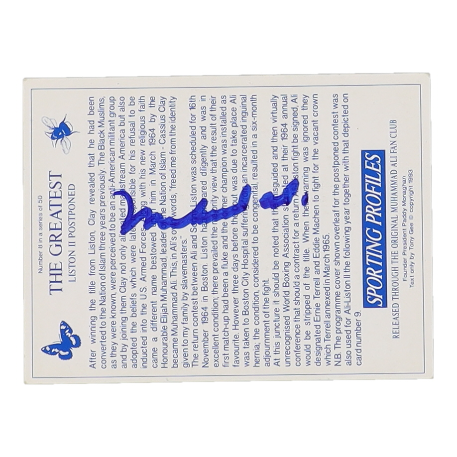 Trading card has been hand-signed by Muhammad Ali (D. 2016, HOF).