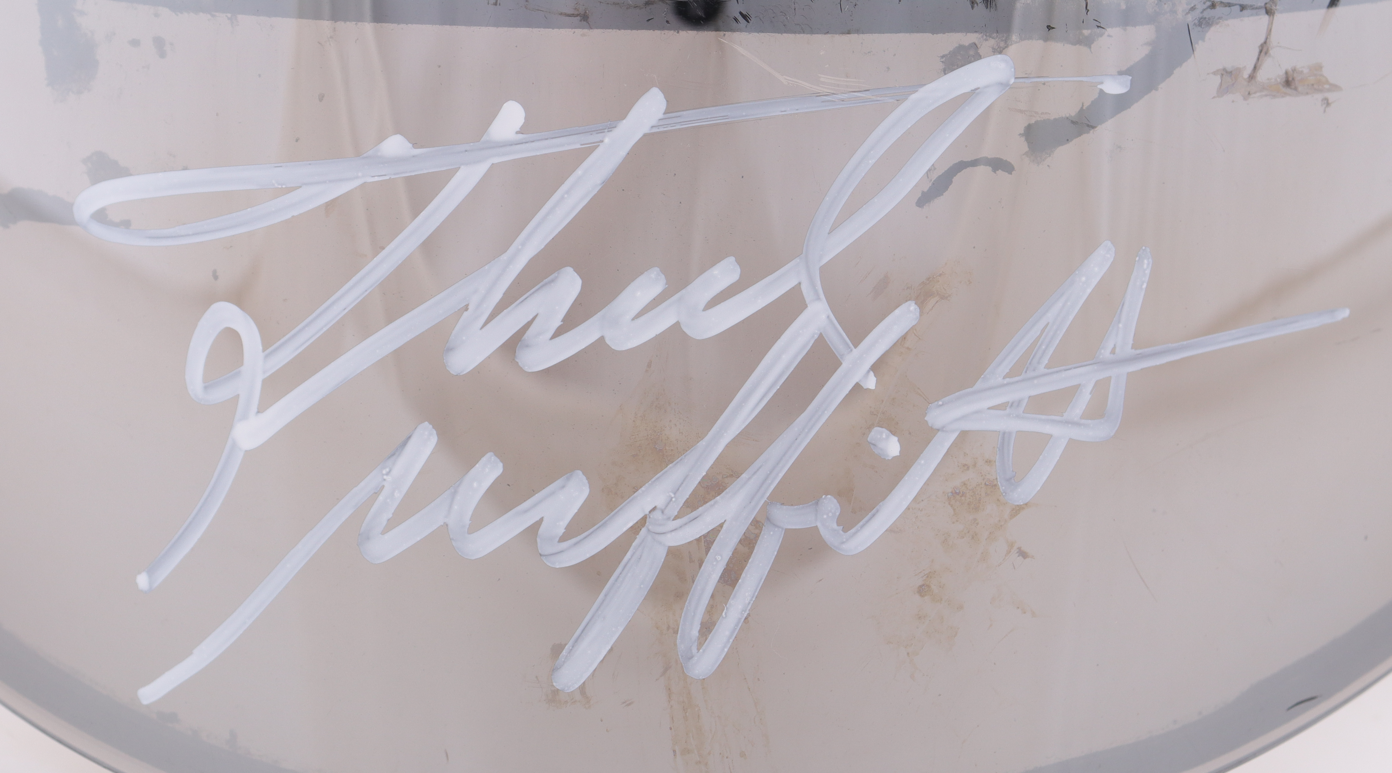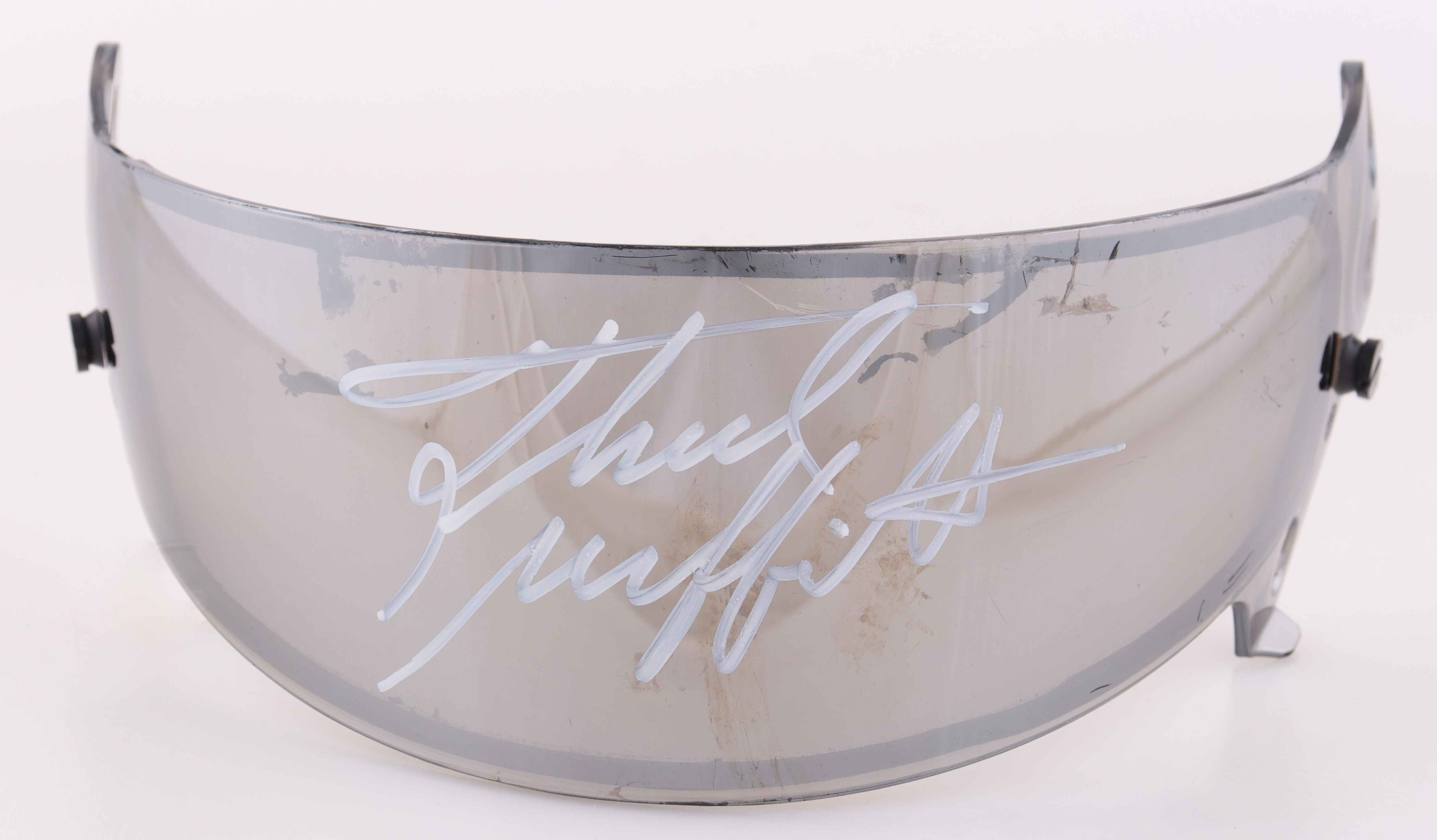 This visor comes from Thad Moffitt's collection and is hand-signed by Moffitt. The visor was race used.
