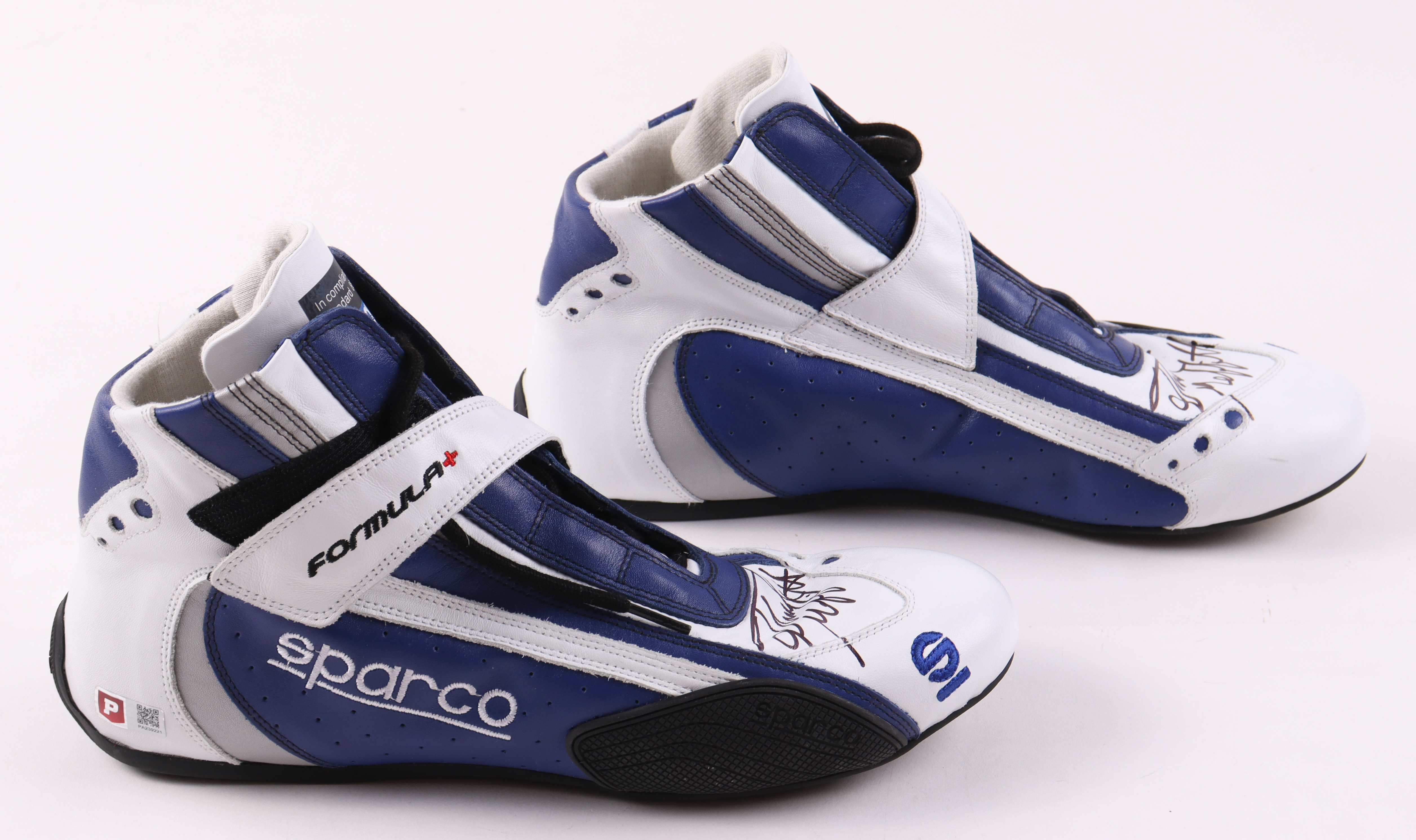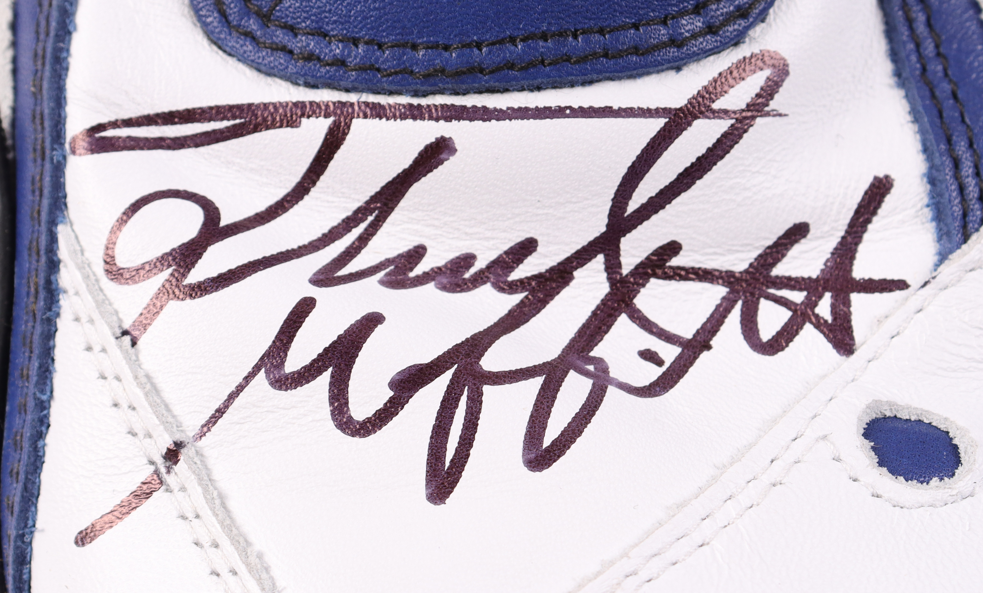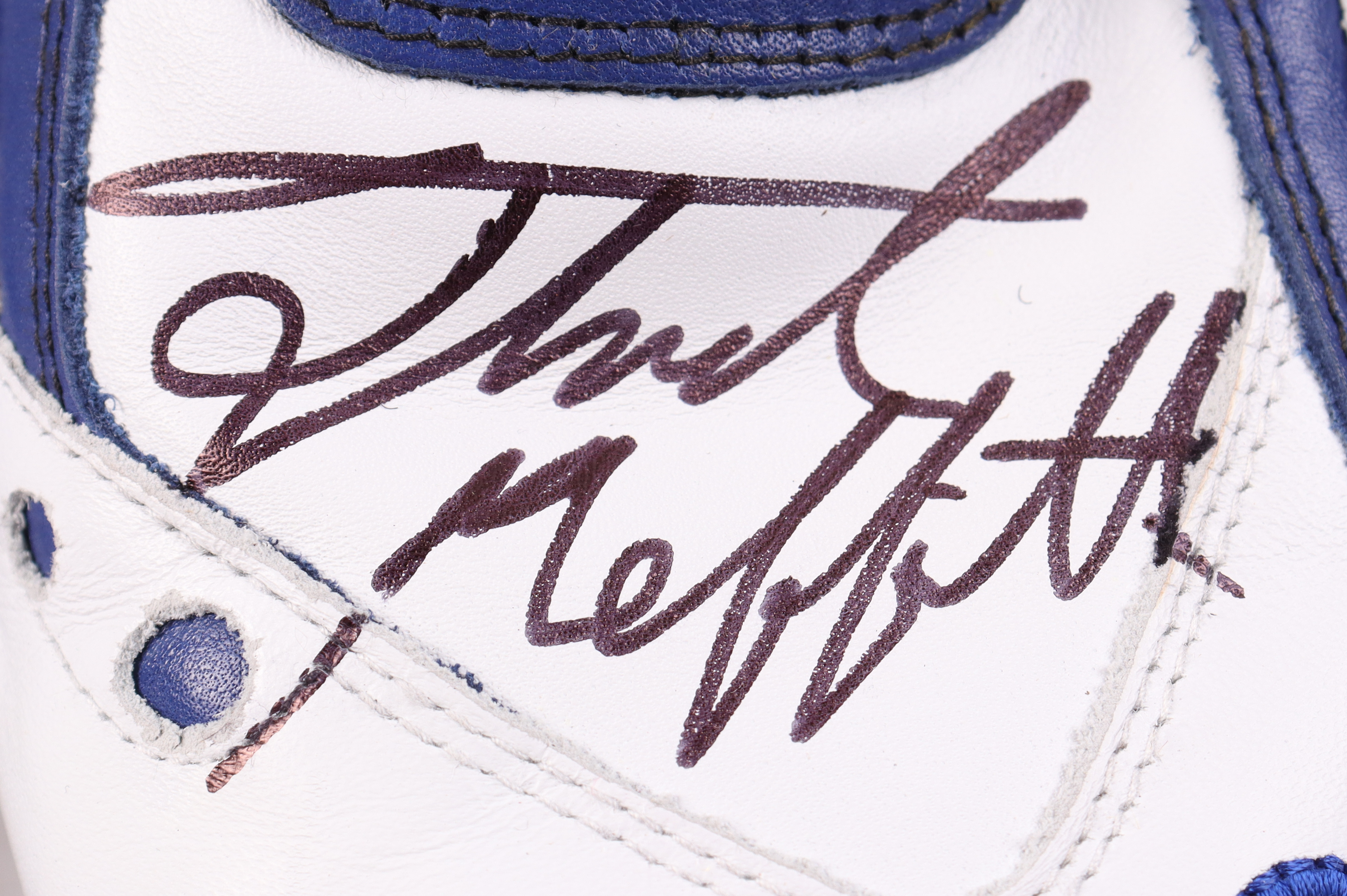 This pair of shoes comes from Thad Moffitt's collection and both are hand-signed by Moffitt. The shoes were issued to Moffitt for race use.