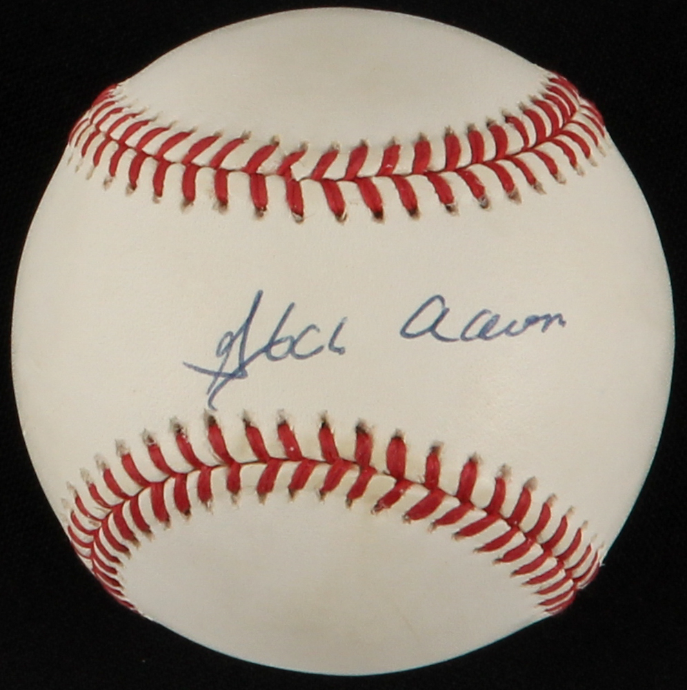 Official National League Baseball. Hand-signed in blue ink pen by Hank Aaron (Braves, HOF).