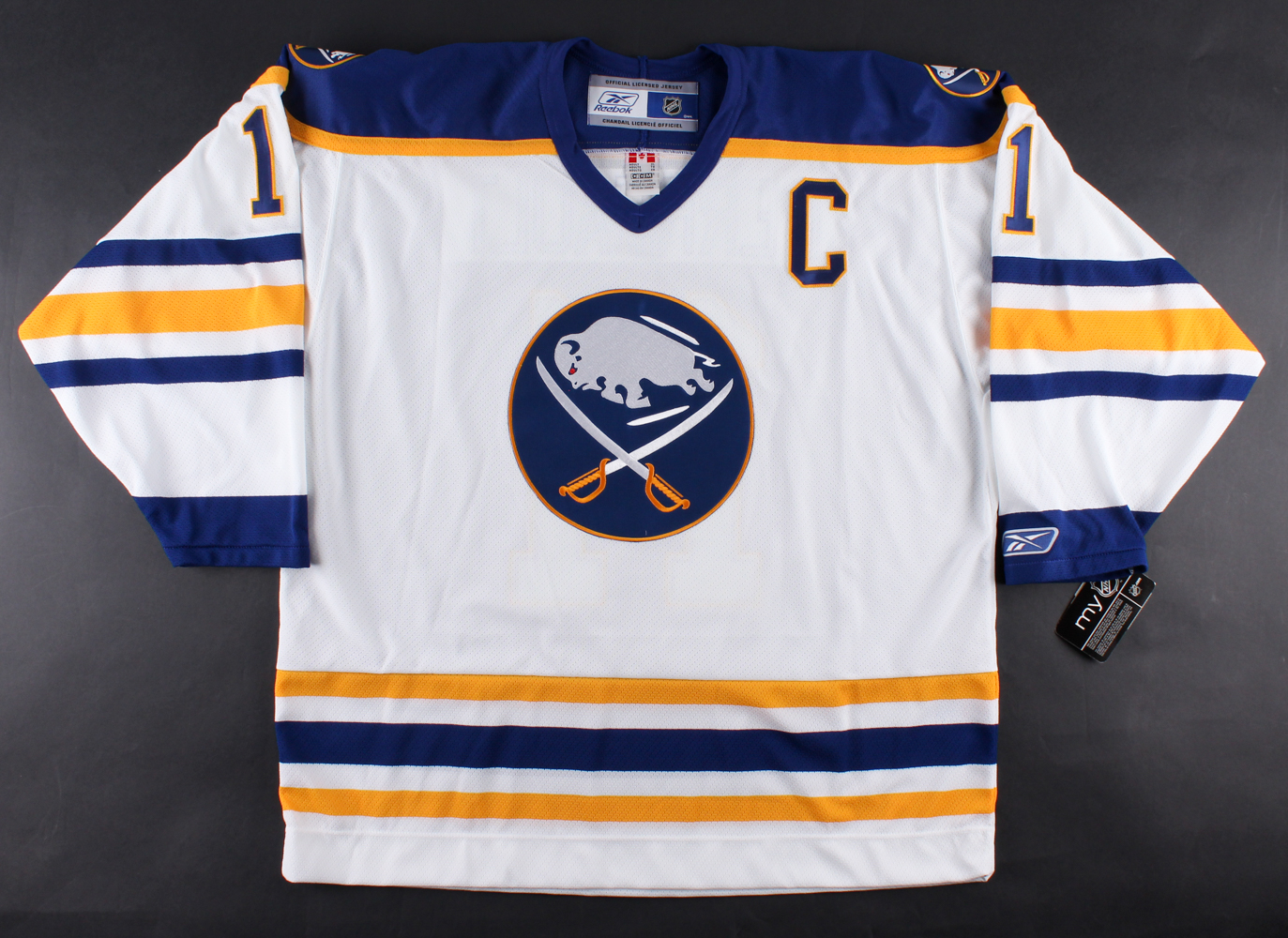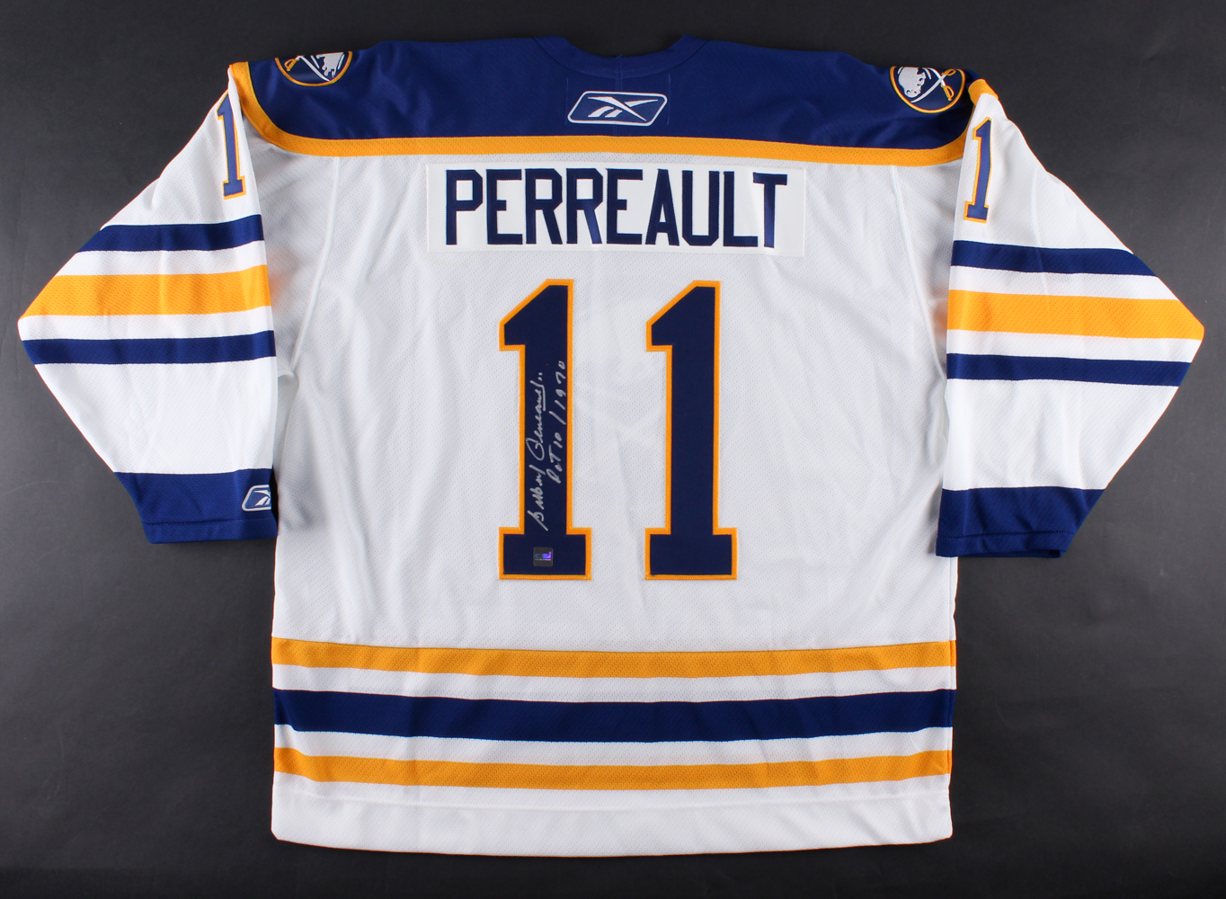 Reebok on-ice style jersey. Everything sewn on, size XL. Hand-signed and inscribed in silver paint pen by Gilbert Perreault (Sabres, HOF). Dated October 10, 1970, the date Perreault scored a goal in the franchise's very first game.