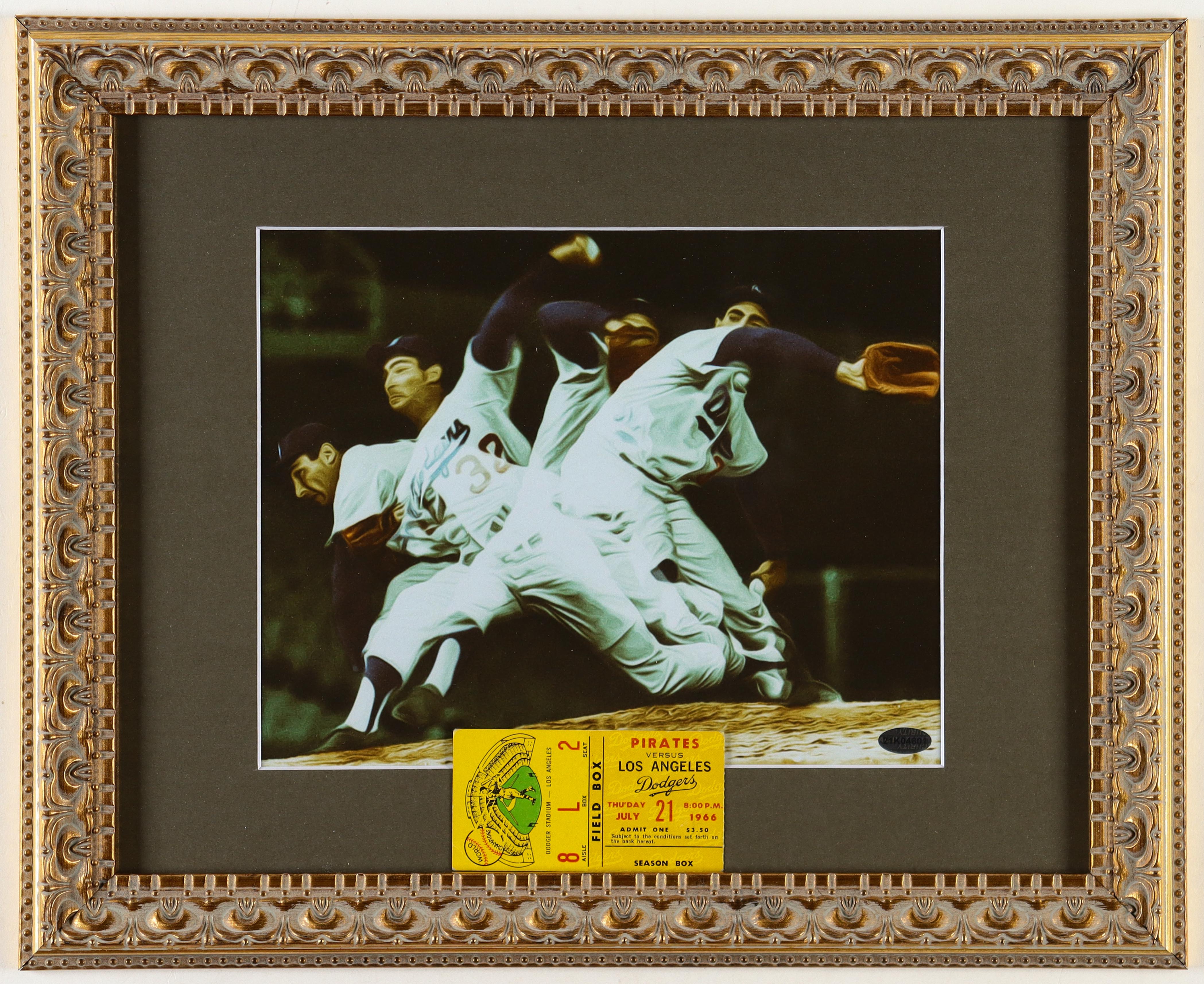 Custom frame measures approximately 13.5" x 16.5" in size and features a photo that depicts Sandy Koufax (Los Angeles Dodgers, HOF). Display also includes Vintage 1966 Dodger Stadium Ticket from Koufax's final season. Please note, the display is unsigned.