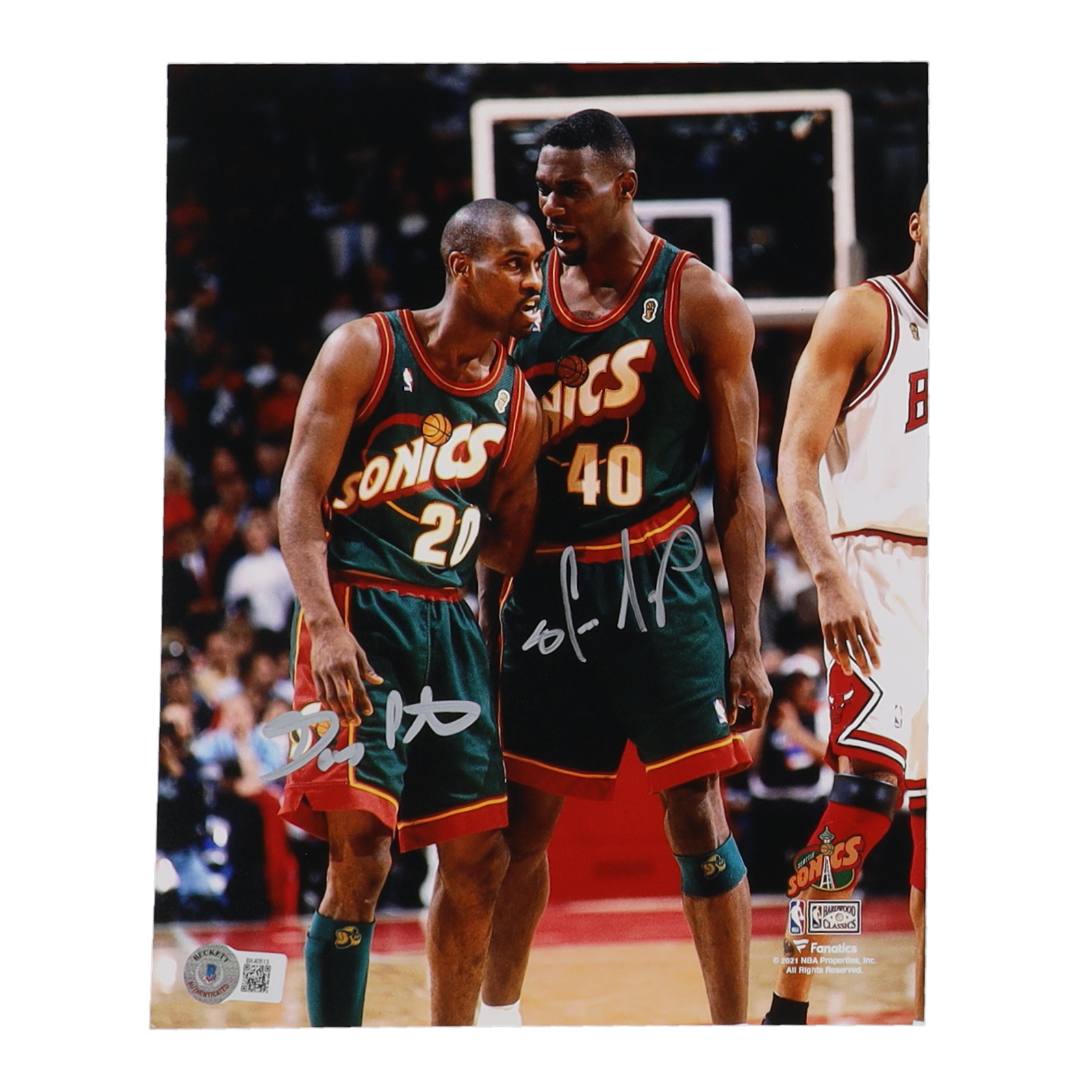 Photo measures 8" x 10" in size and has been hand-signed by Shawn Kemp (Seattle SuperSonics) and Gary Payton (Seattle SuperSonics, HOF).