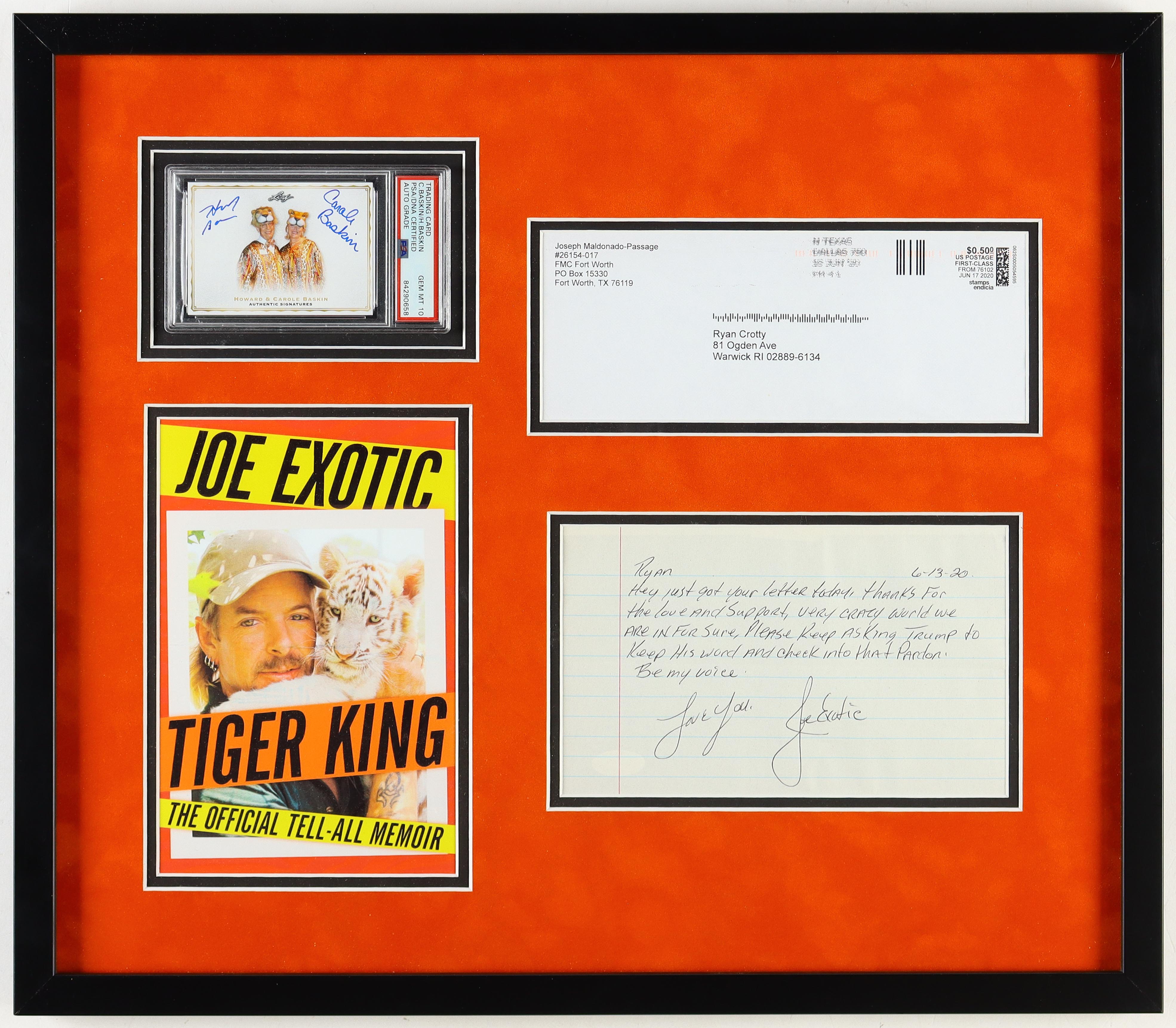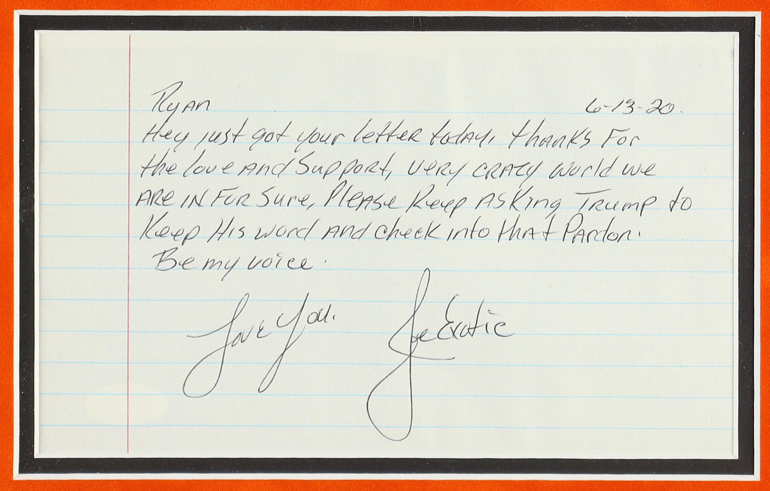 Custom frame measures 18.5" x 21.5" in size and features a 2020 Leaf Tiger King #HCB02 trading card that has been hand-signed by Carole Baskin and her husband Howard! Along with the framed display is a hand-written letter that has been hand-signed by Joe Exotic! The contents of the letter are in regards to Joe Exotic hoping that President Trump keeps his word about a pardon for him. The letter reads: