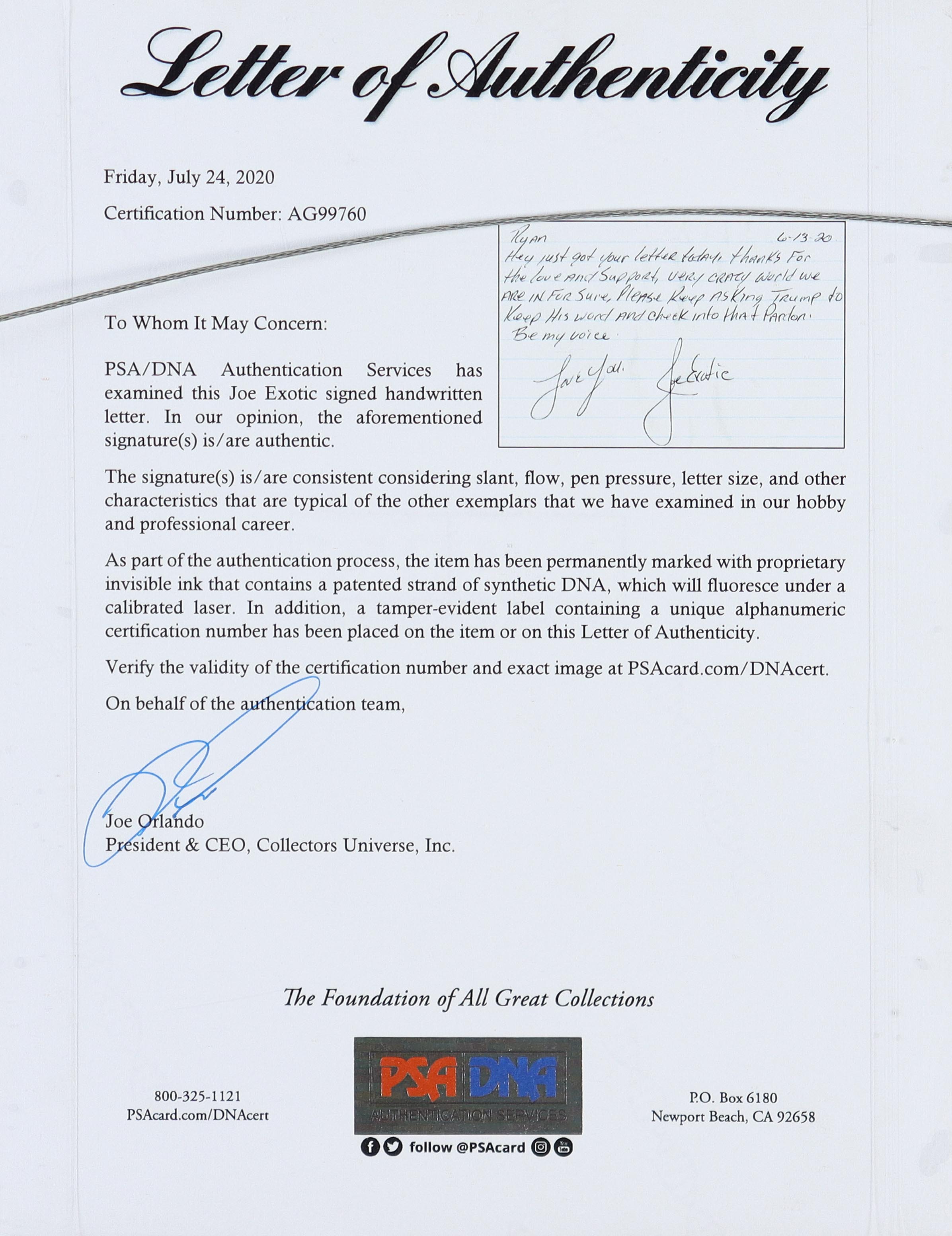 The 2020 Leaf Tiger King #HCB02 card has been authenticated and encapsulated by PSA/DNA and the Joe Exotic letter includes an official PSA/DNA hologram and matching LOA for authenticity purposes.