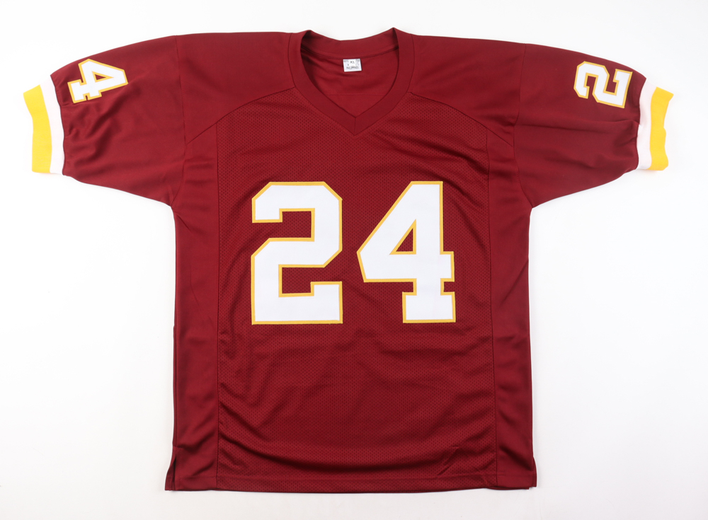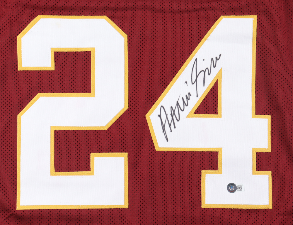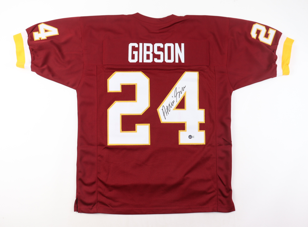 Custom football jersey. Everything sewn on, size XL. Hand-signed by Antonio Gibson. Please note, the jersey color is visible through the jersey numbers and there is a stain on the reverse number.