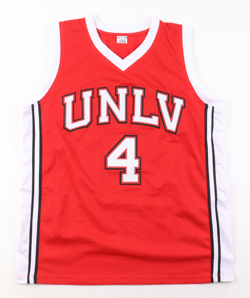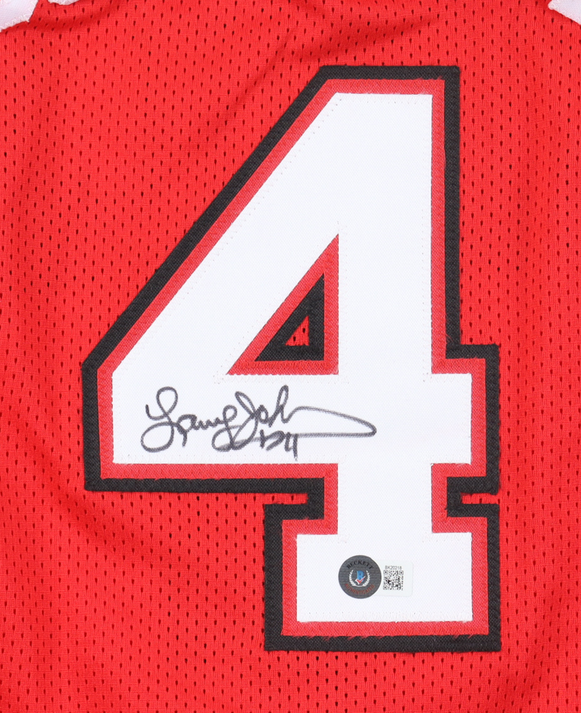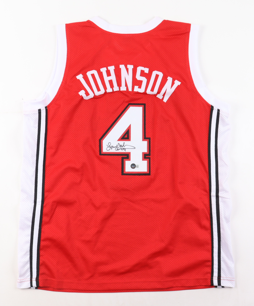 Custom basketball jersey. Everything sewn on, size XL. Hand-signed by Larry Johnson.