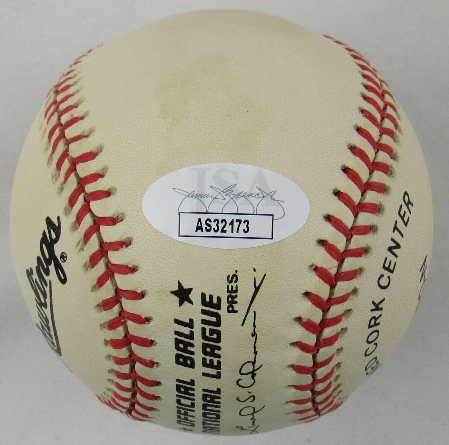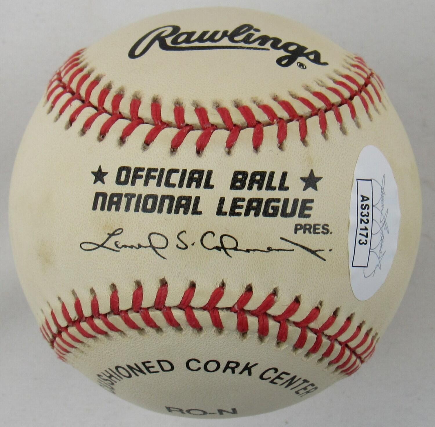 Rawlings Official National League Baseball hand-signed and inscribed by Warren Spahn (D. 2003, Milwaukee Braves, HOF). Please note, the baseball is naturally toned.