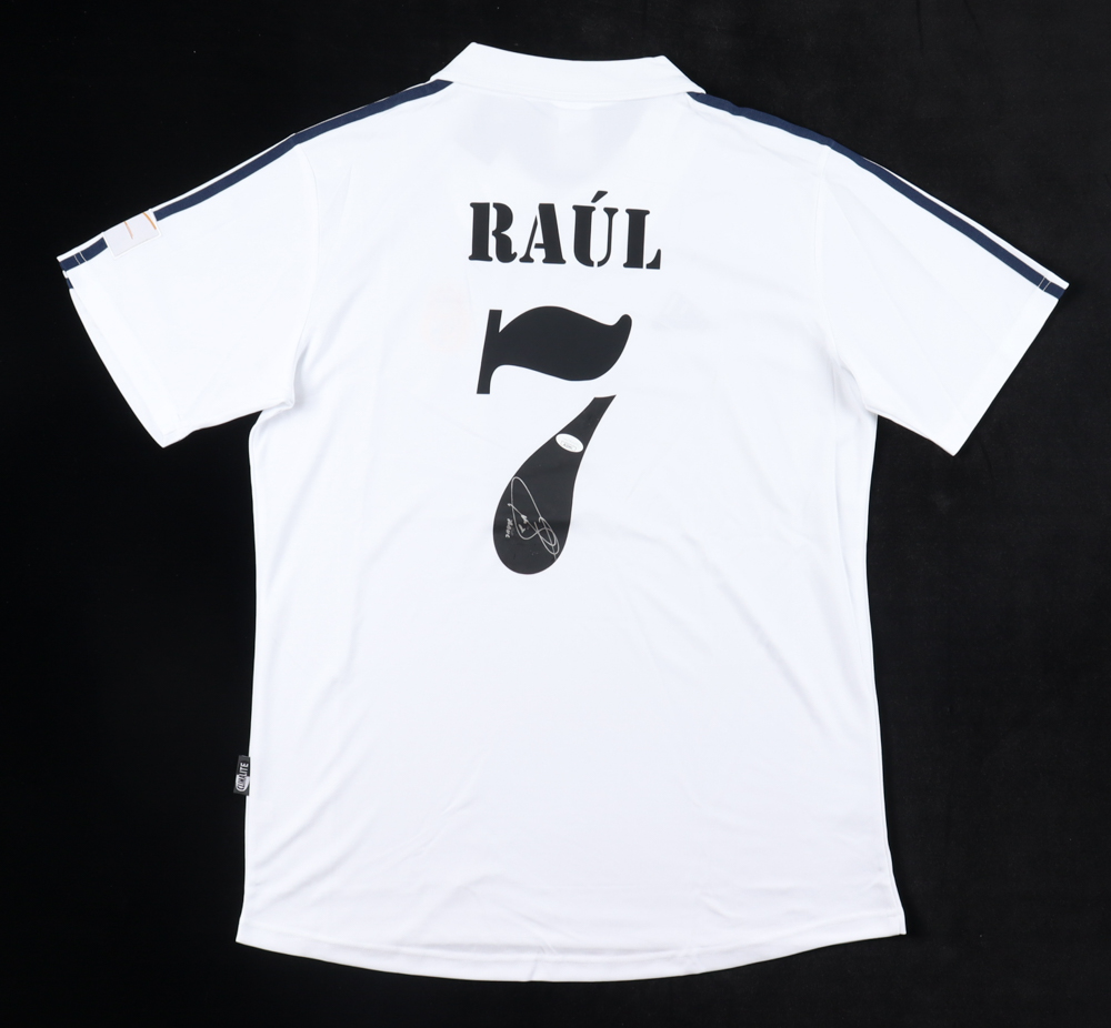 Adidas jersey with everything printed on, size XL. Hand-signed by Raul Gonzalez (Real Madrid). Please see photos for more details.