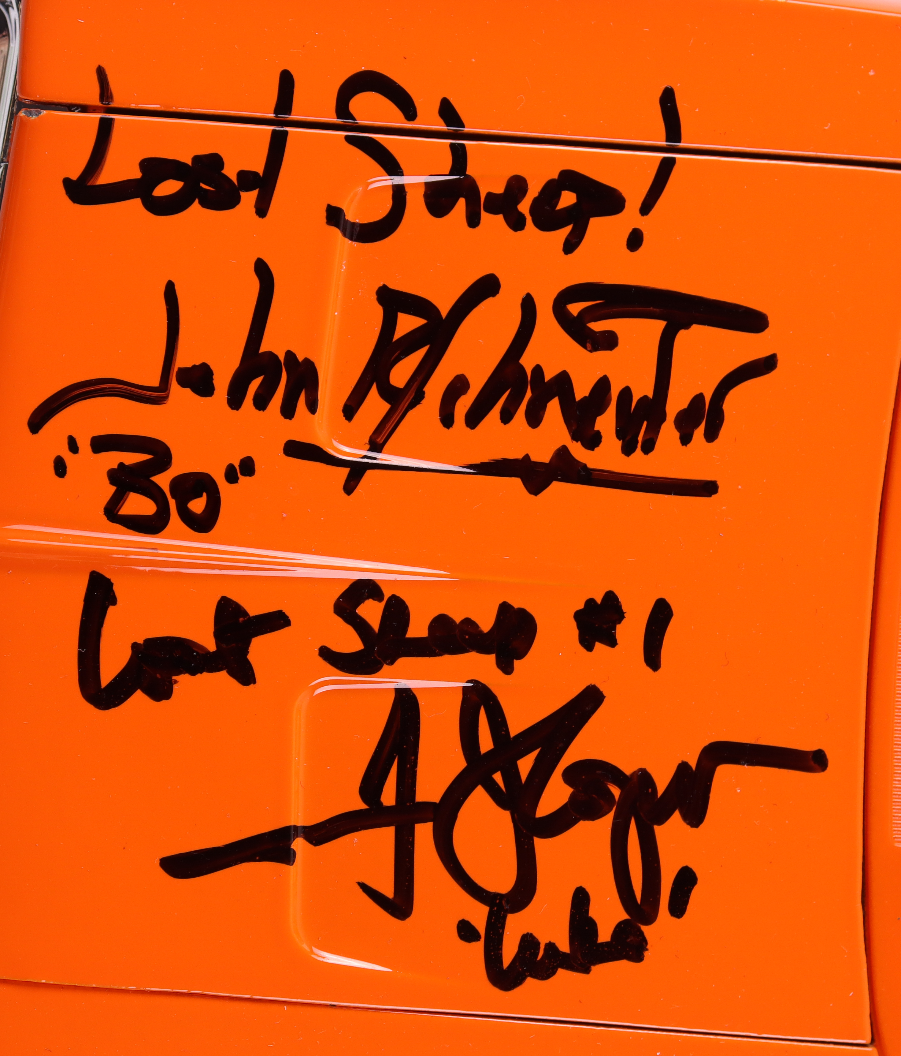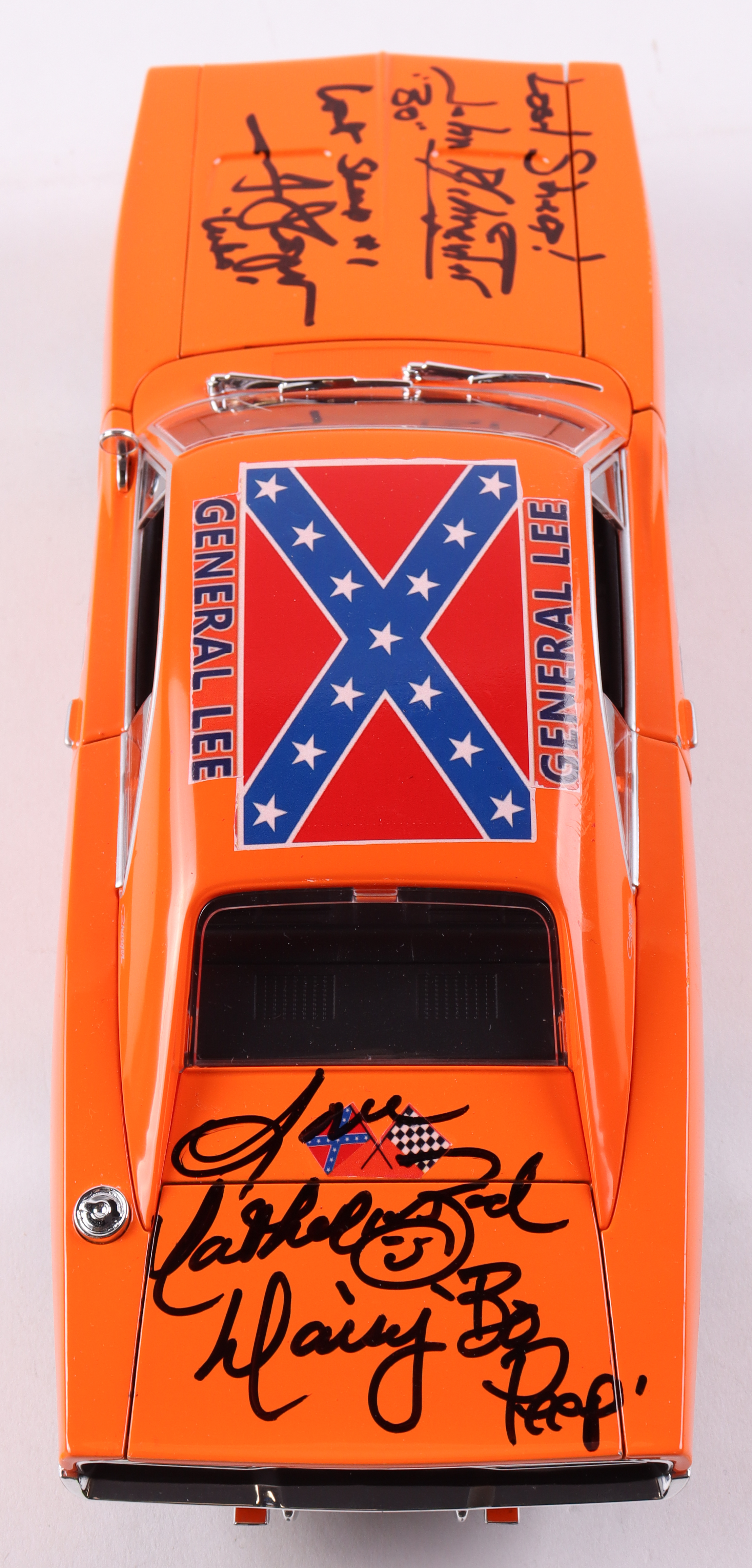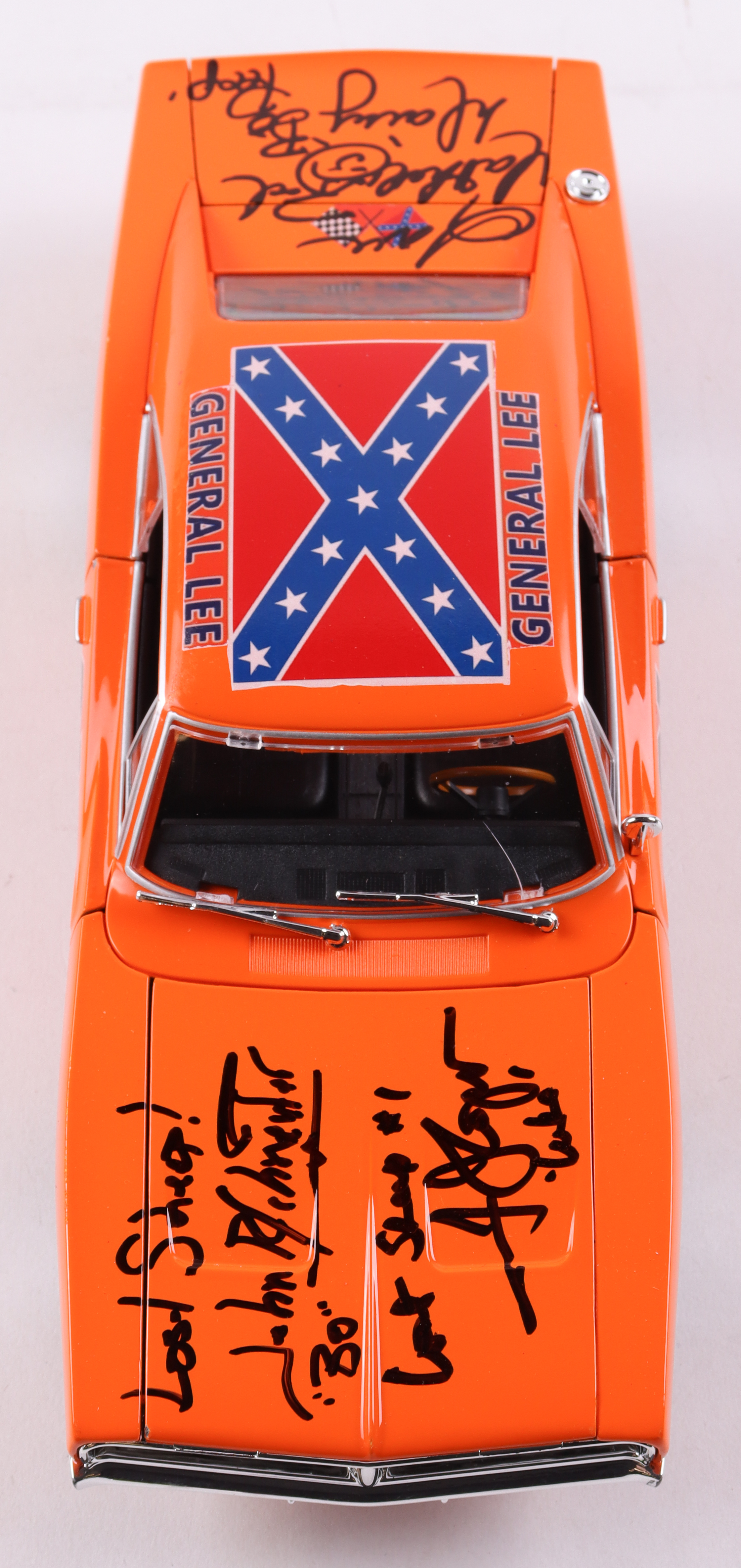 1:25 scale General Lee “The Dukes Of Hazzard” die-cast car. Hand-signed and inscribed by John Schneider (Bo Duke), Tom Wopat (Luke Duke), and Catherine Bach (Daisy Duke).