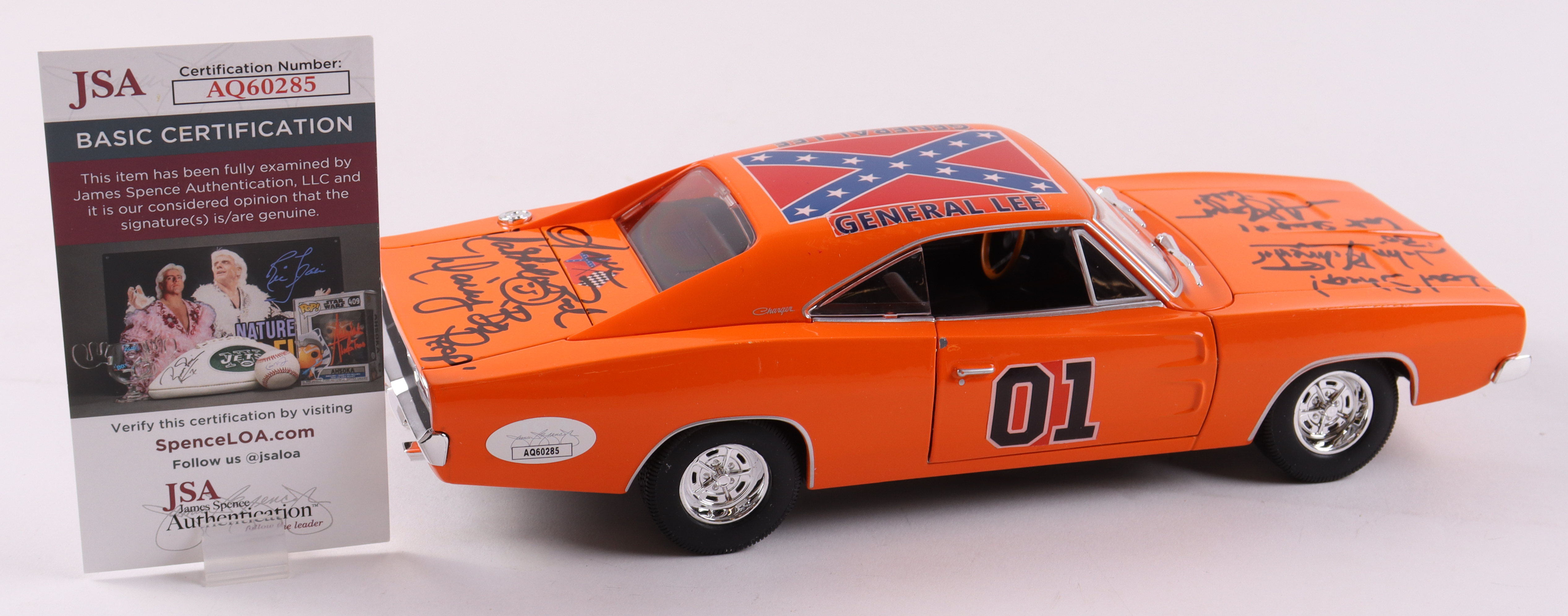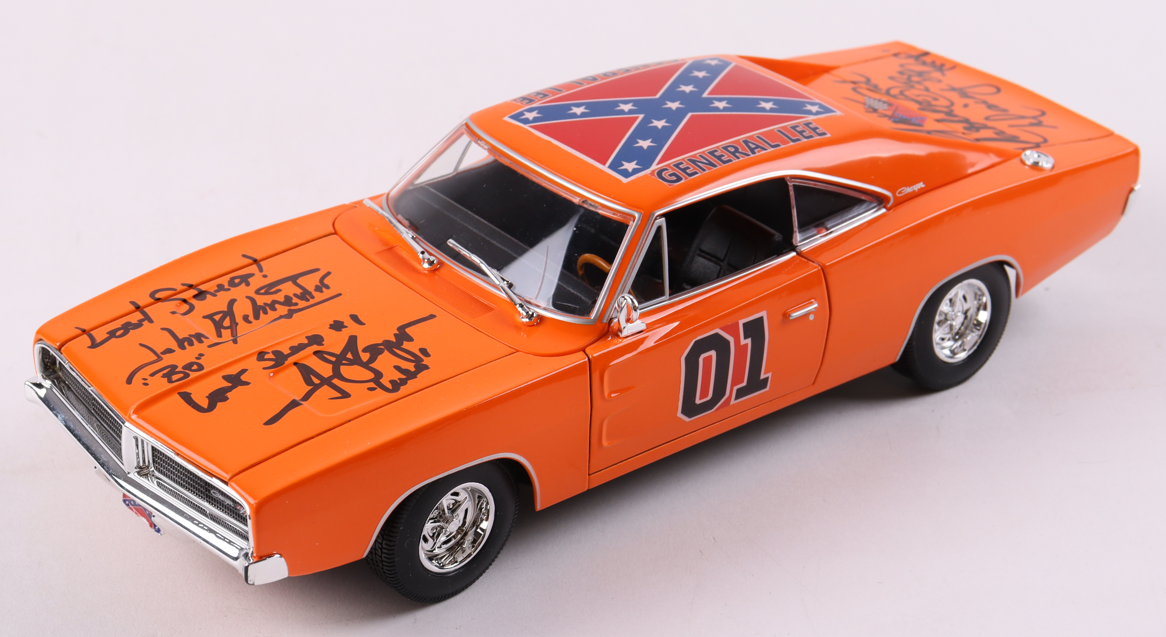 John Schneider, Tom Wopat, & Catherine Bach Signed "Dukes of Hazzard" 1:25 General Lee Die Cast Car with Character Inscriptions (JSA)