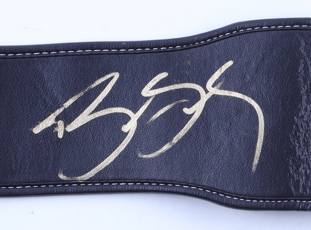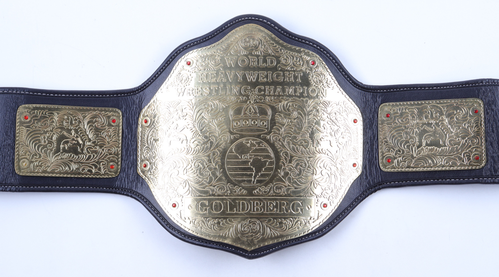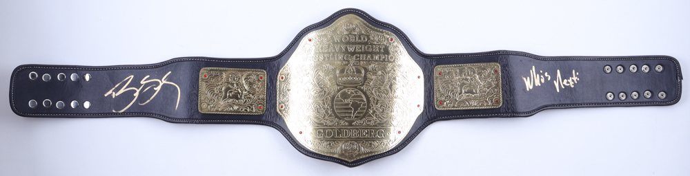 Hand-signed and inscribed WCW Big Gold Championship belt by Bill Goldberg. Please note belt is not an official replica and the signature is smudged.