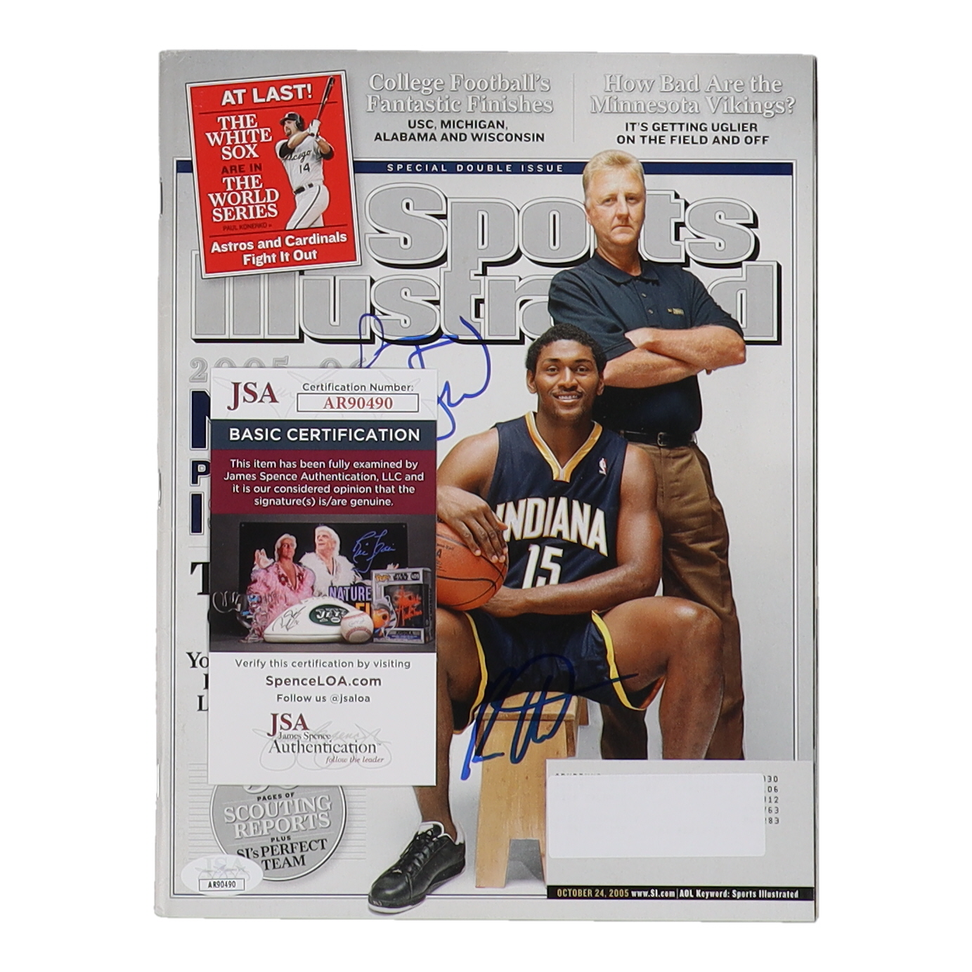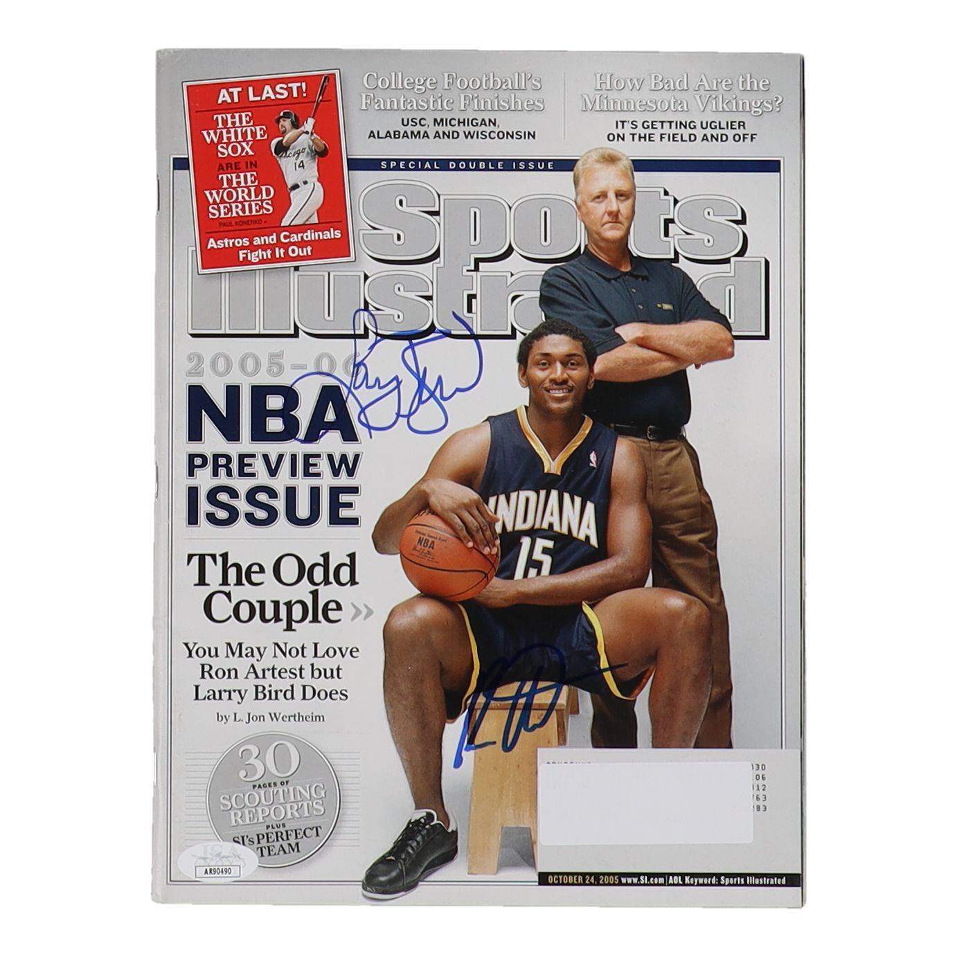 Magazine dated October 24, 2005 has been hand-signed by Larry Bird (Boston Celtics, HOF) and Ron Artest (Indiana Pacers).