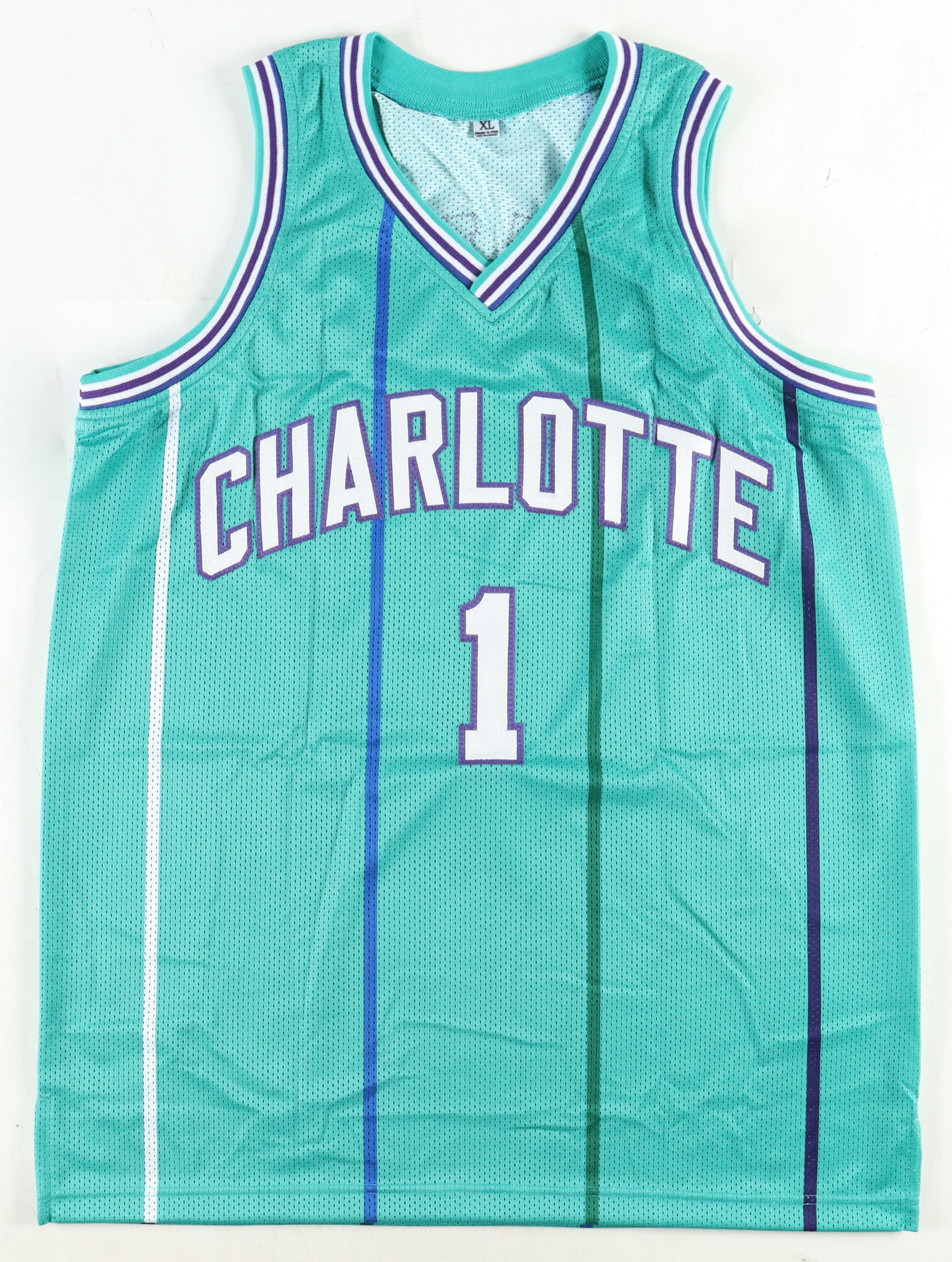 Custom jersey. Everything is sewn on, size XL. Hand-signed by Muggsy Bogues.
